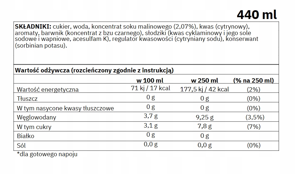 В одній пляшці 440 мл є концентрат, з якого ви підготуєте стільки, скільки 9 літрів raspberry edreshment!
