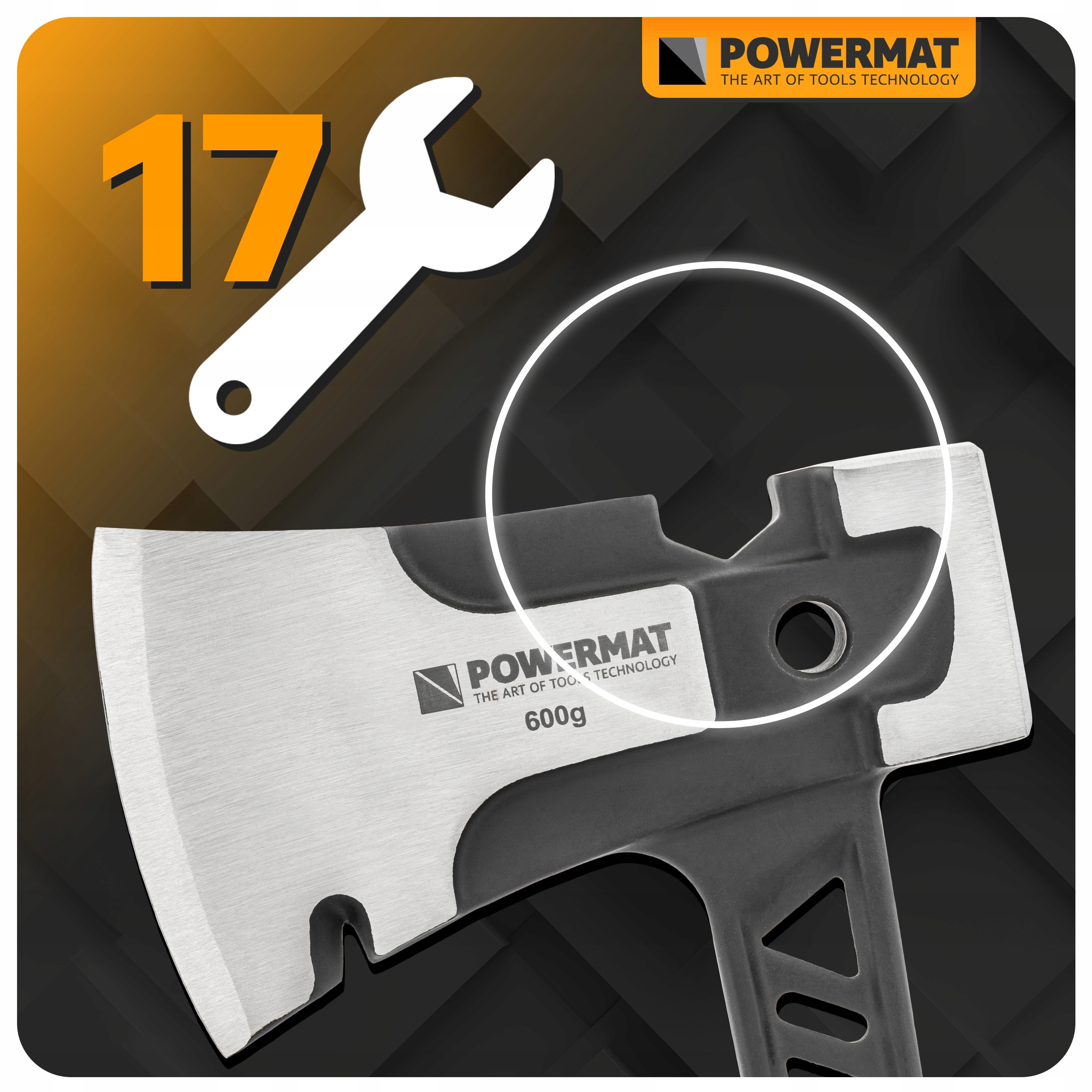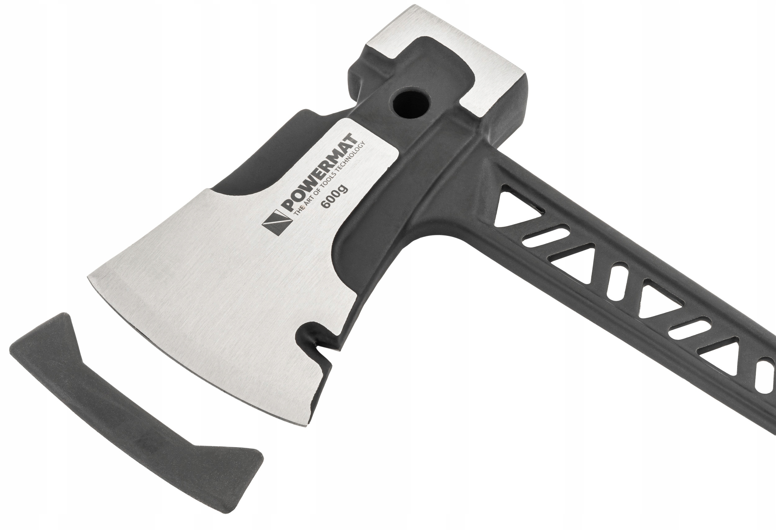 Столярська сокира Powermat 3 в 1 із загартованої моноблочної сталі поєднує в собі функції сокири, молотка та гайкового ключа на 17 мм. Оснащений інструментом для витягування цвяхів, нековзкою ручкою з поглинанням вібрації та ідеальним балансом (910 г), він гарантує довговічність, точність і комфорт роботи під час їзди, підхоплення, роздавлювання та розколювання.