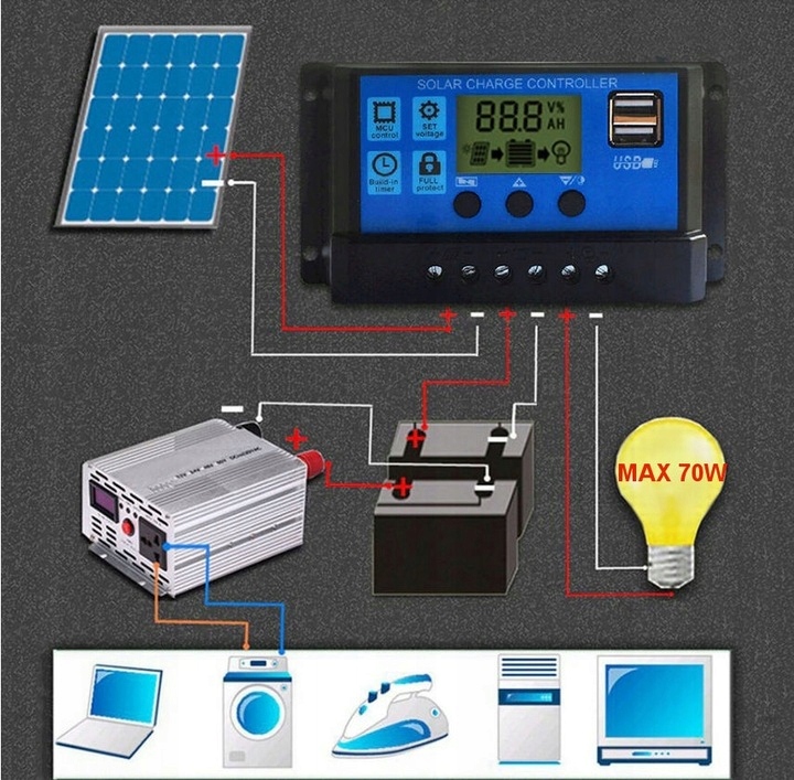 Сонячний регулятор і контролер заряду для фотоелектричних панелей 12/24 В з РК-дисплеєм і портами USB. Регулятор обробляє енергію, що подається від панелей до акумулятора, і одночасно захищає від перезаряду акумуляторів і надмірного розряду приймачами, підключеними до регулятора. Максимальна напруга підключених фотоелектричних панелей не може перевищувати 50 В.