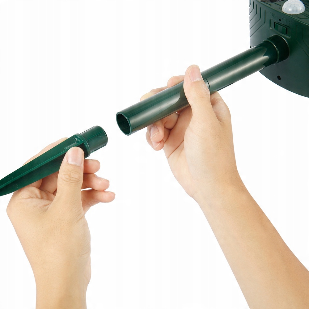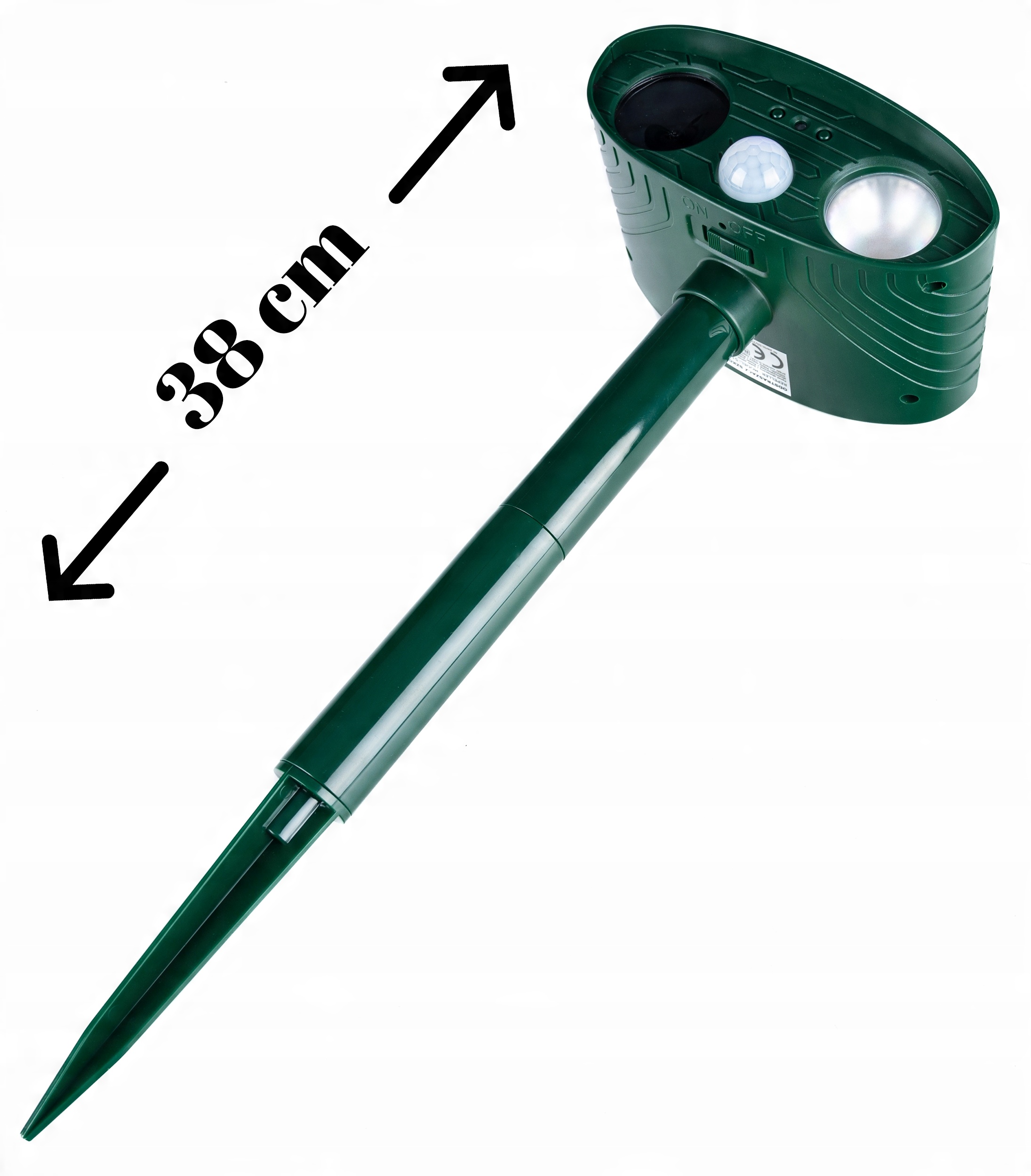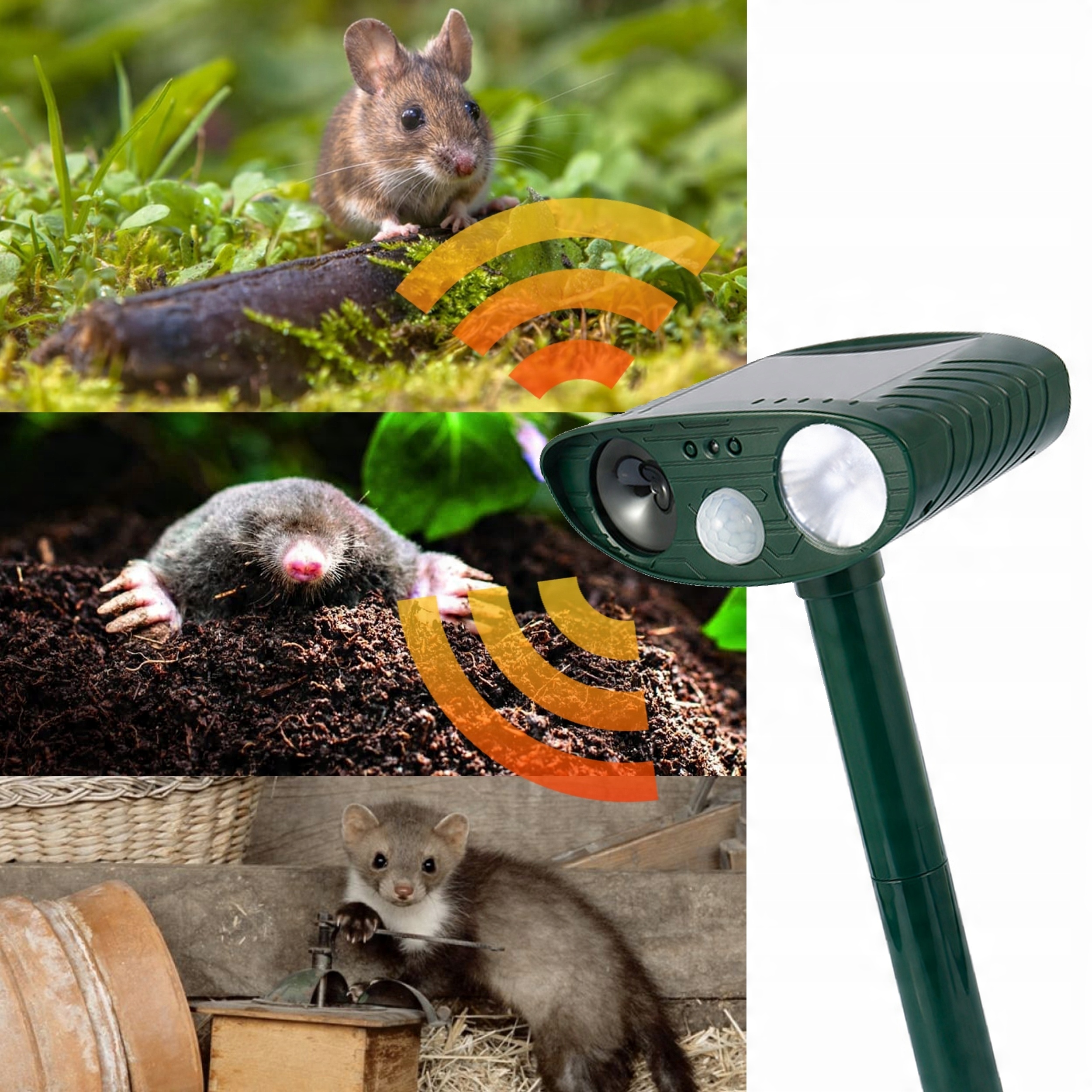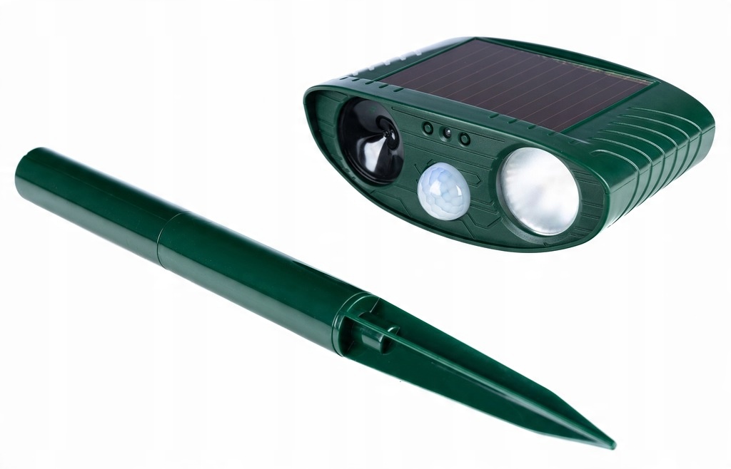 Ефективний відлякувач тварин, заснований на принципі випромінювання різних ультразвукових частот і потужного світлодіодного світла. Видавані звуки та спалахи світла дуже набридають тваринам, тому вони ефективно їх відлякують, не завдаючи їм шкоди. Прилад вмикається, коли тварина потрапляє в зону дії датчика руху, що економить енергію.