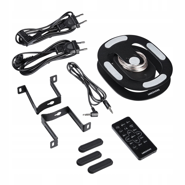 Ця звукова панель є справді універсальним пакетом, оскільки вона не лише забезпечує надзвичайно потужний звук, але й вражає широким набором аксесуарів. Ви зручно лежите на дивані і хочете змінити гучність або налаштування звуку звідти? Пульт дистанційного керування з двома батарейками ААА, що входить у комплект, полегшить вам це завдання. Хочете відрегулювати положення звукової панелі? За допомогою додаткового матеріалу для настінного кріплення ви можете розмістити звукову панель саме там, де вона найкраще підходить для вашого комфортного простору.