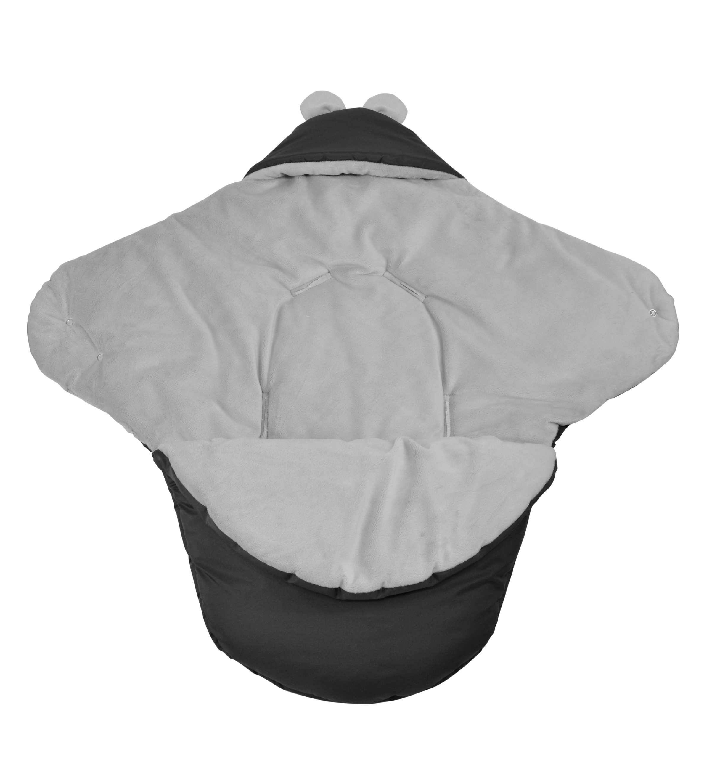Спальний мішок має капюшон, який захищає голову дитини. Кольори тканин і кумедні вушка на капюшоні роблять спальний мішок і дитину в ньому чарівними.