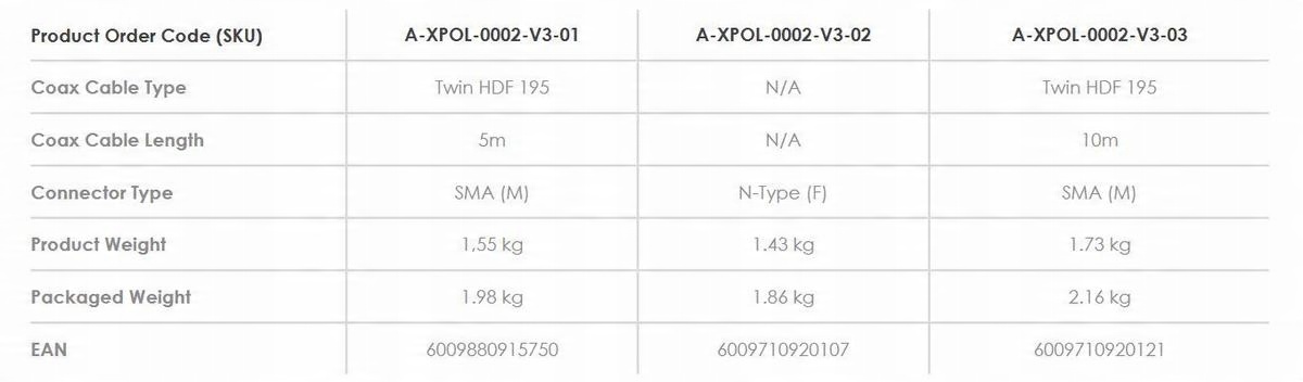 - Доступний у трьох варіантах: кабель SMA довжиною 5 м, кабель SMA 10 м і розетка N;