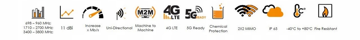 - Надширокосмуговий робочий діапазон від 698 до 960 МГц, від 1710 до 2700 МГц і від 3400 до 3800 МГц;