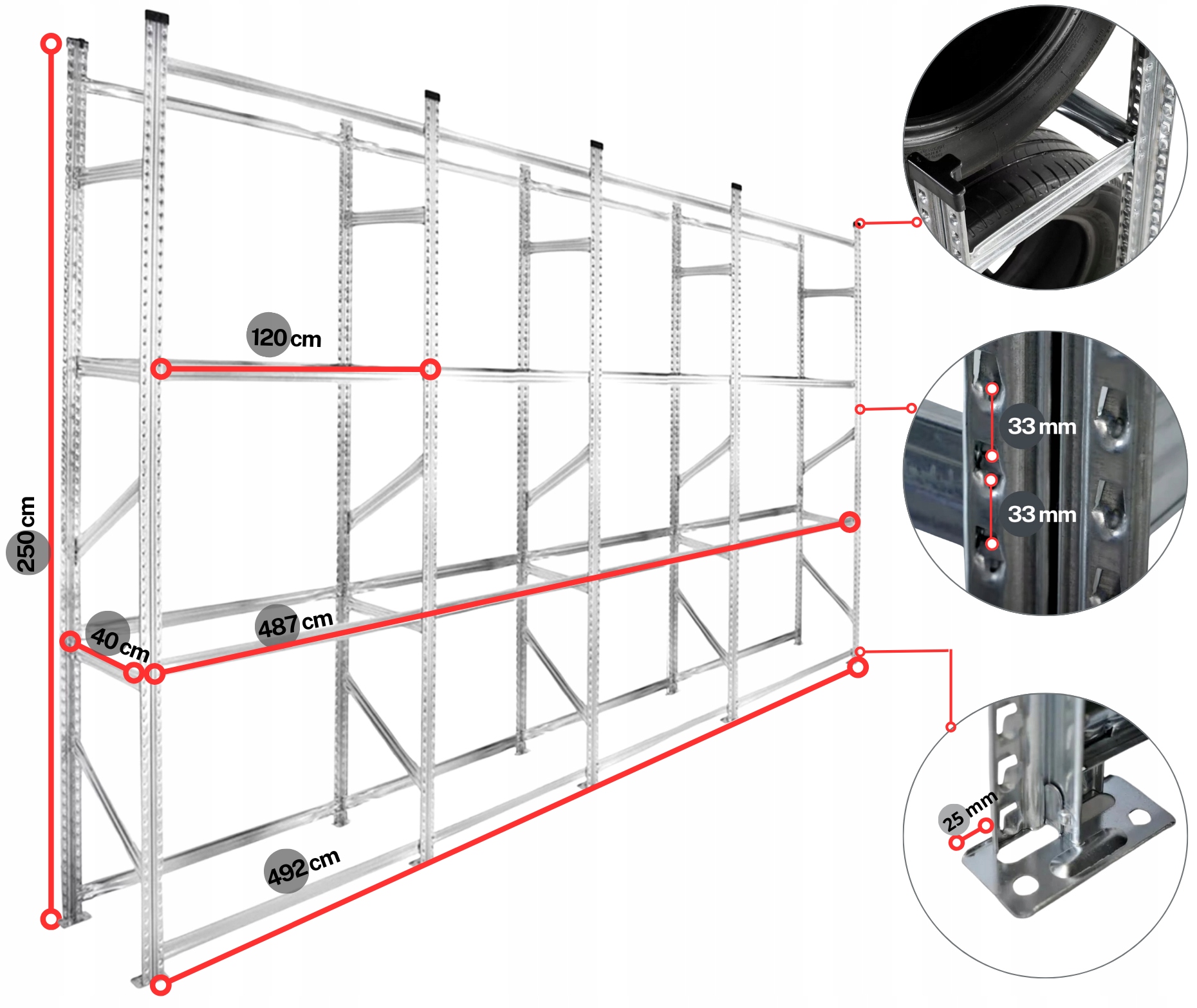 Відстань між перфораціями кожні 33 мм, що дає можливість регулювати висоту рівнів зберігання відповідно до розміру шин/колес, причому максимальна відстань між рівнями становить 70 см.