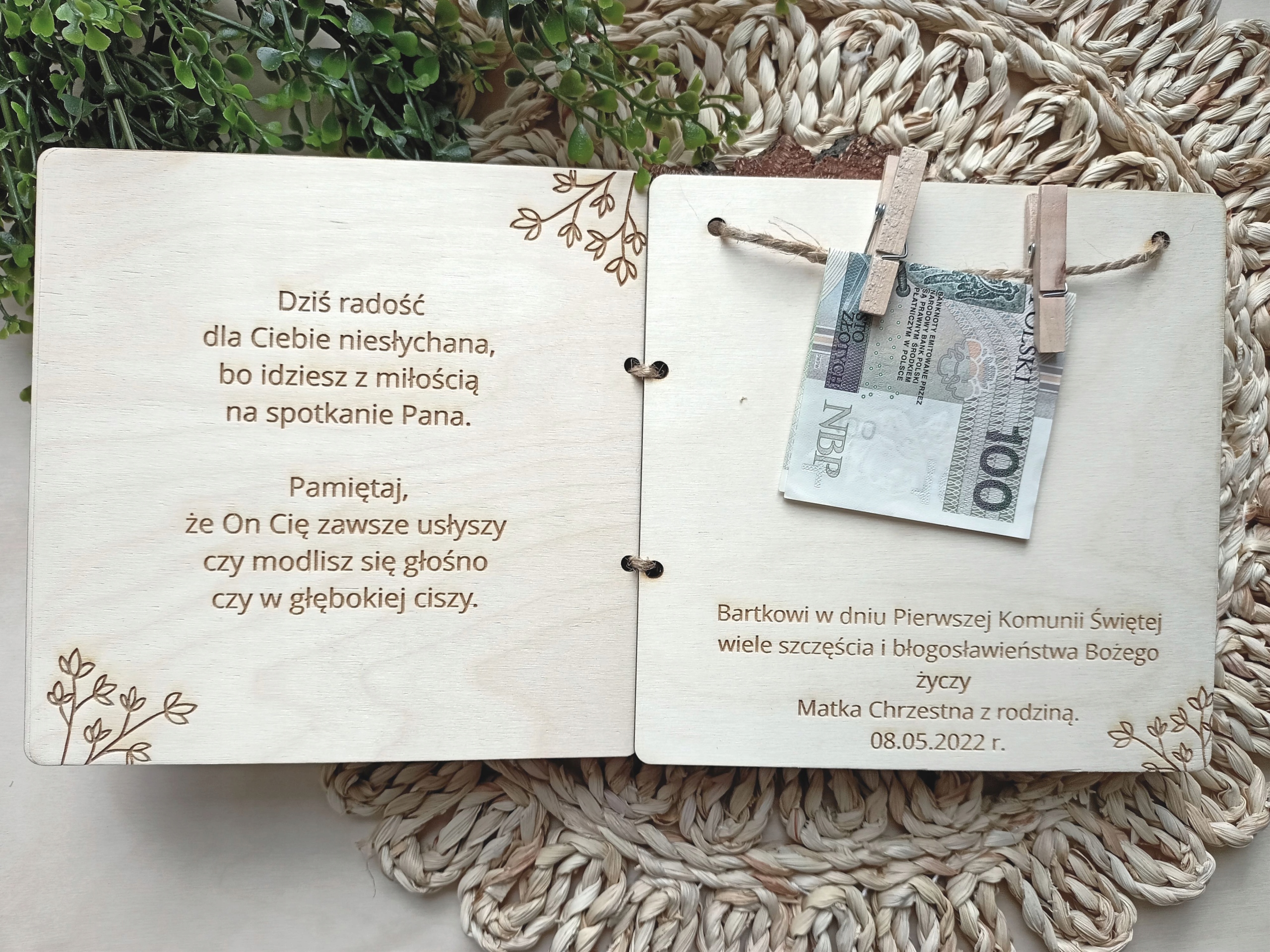 На сувенірі є шнурок і дві дерев'яні кліпси, на які можна повісити гроші або фото (13х9). см).