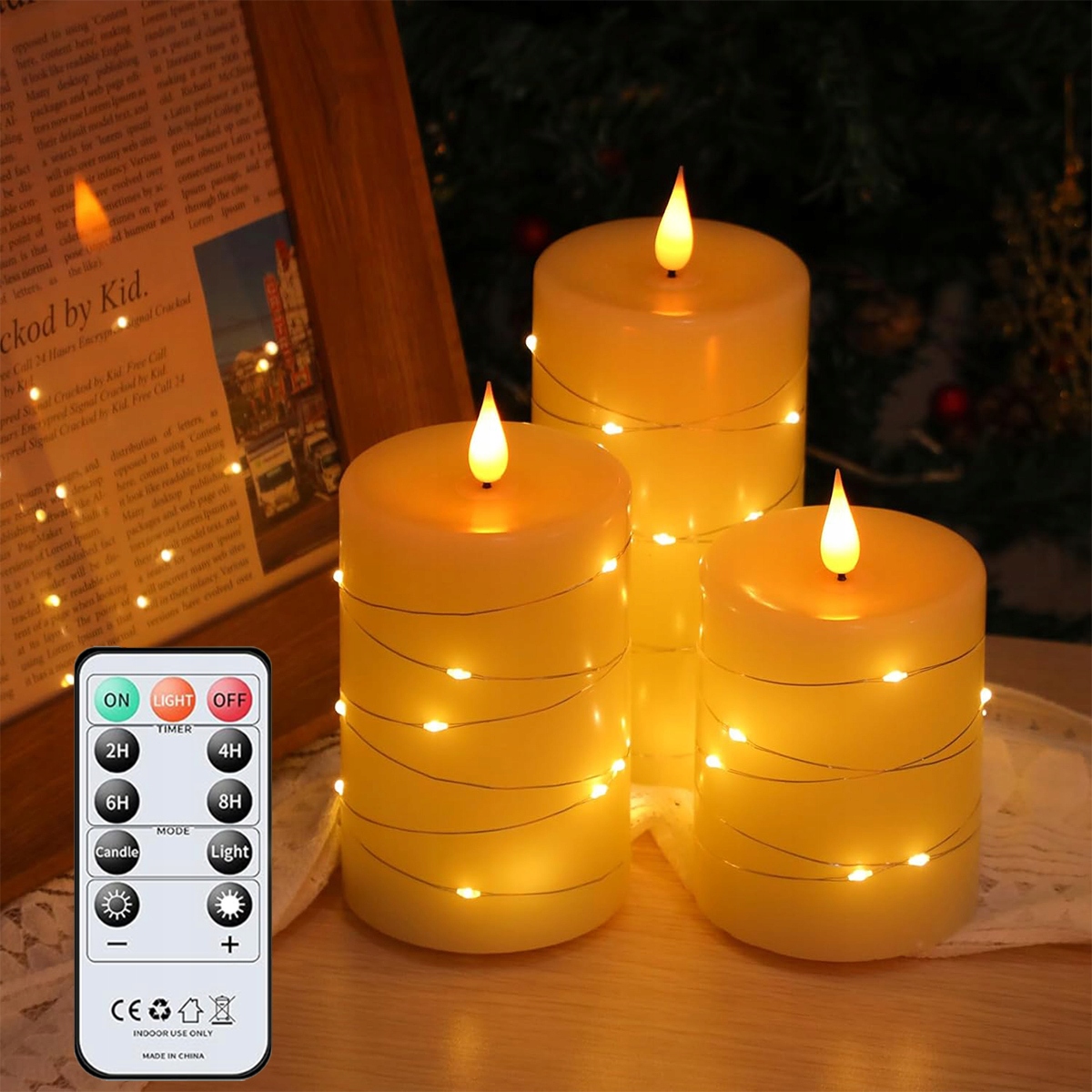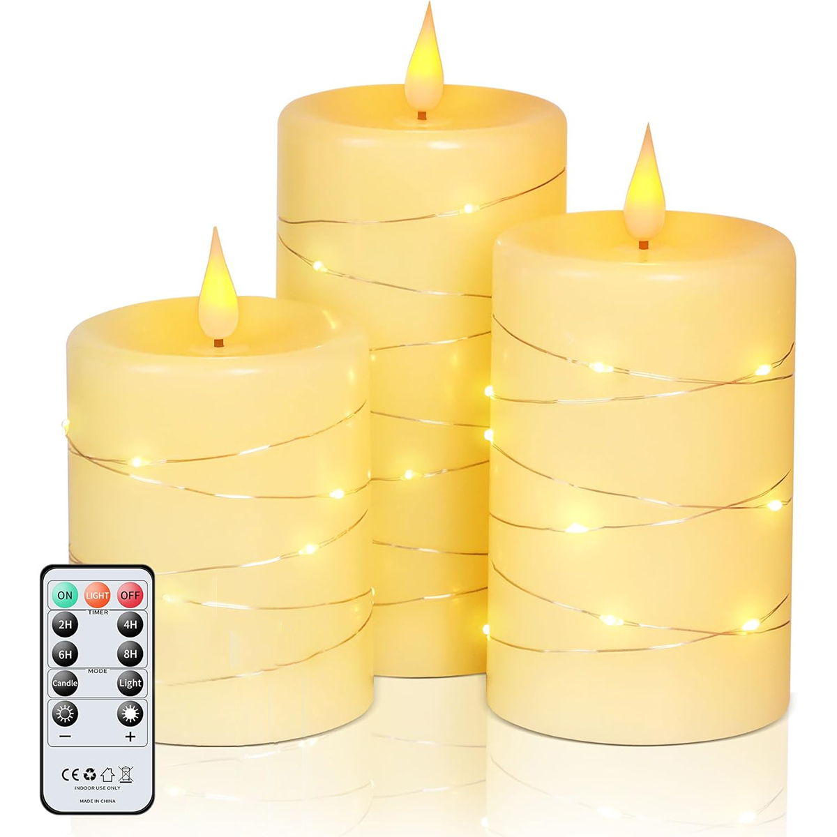 🌟🌟 Мерехтливі безполум’яні свічки з ялинковими вогнями, свічки на батарейках із дистанційним керуванням і таймером, вбудовані ялинкові вогні, світлодіодні свічки теплого білого кольору, парафіновий віск кольору слонової кістки, прикраси для дому, набір із 3 штук