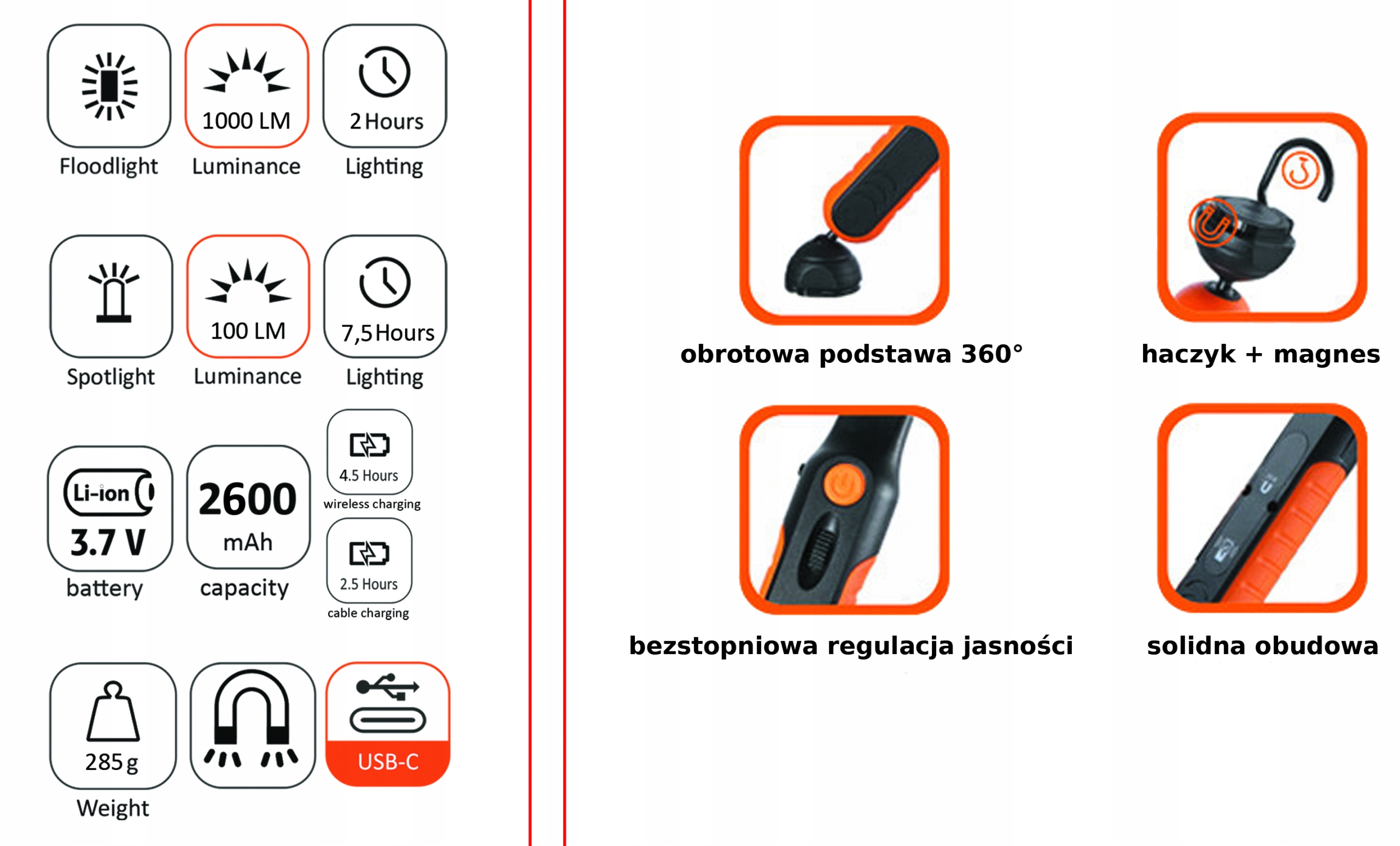 - Надійна світлодіодна лампа незамінна в семінарах та веб -сайтах, в гаражах. Це дуже комфортно та практично , він буде корисним у кожній ситуації, яка вимагає зручного, додаткового джерела світла. Корпус профіленого лампи був виготовлений з високоякісного матеріалу, який надає стійкість до складних умов експлуатації , удару та запобігання ковзанню лампи з мокрої руки. Оснащений сильною магнітною ручкою , що дозволяє прикріпити лампу до металевих поверхонь. Має практичний і корисний гачок , щоб повісити світильник у вибраному місці.