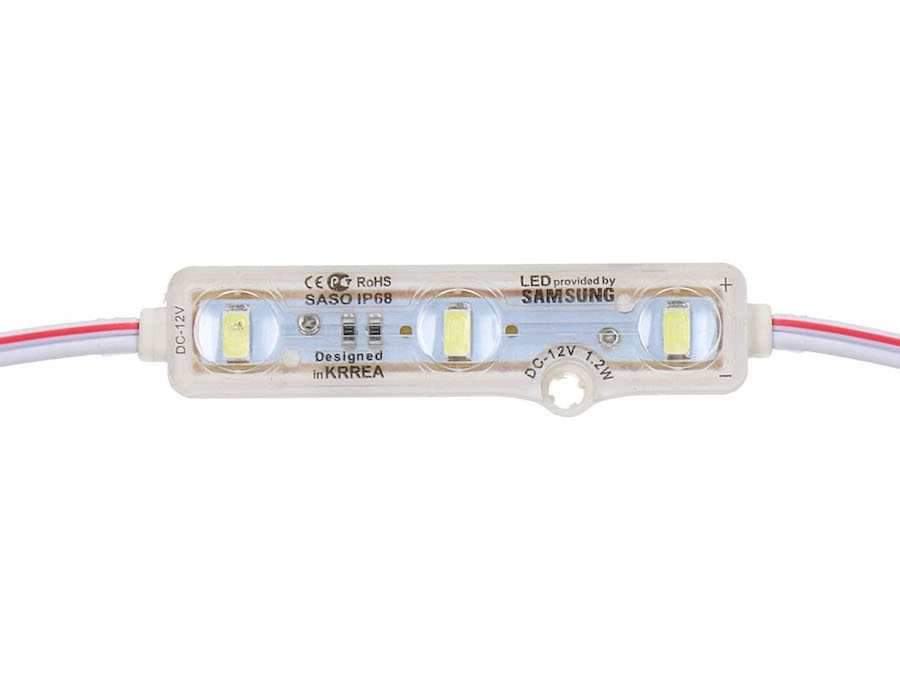 3-діодний світлодіодний модуль на основі найпотужніших діодів SMD5630 - це високоякісний продукт, оптимальний для освітлення: реклами, банерів , світлові літери, рекламні ящики, торгові вітрини, меблі, стелажі, сходи, сади, автомобілі тощо.