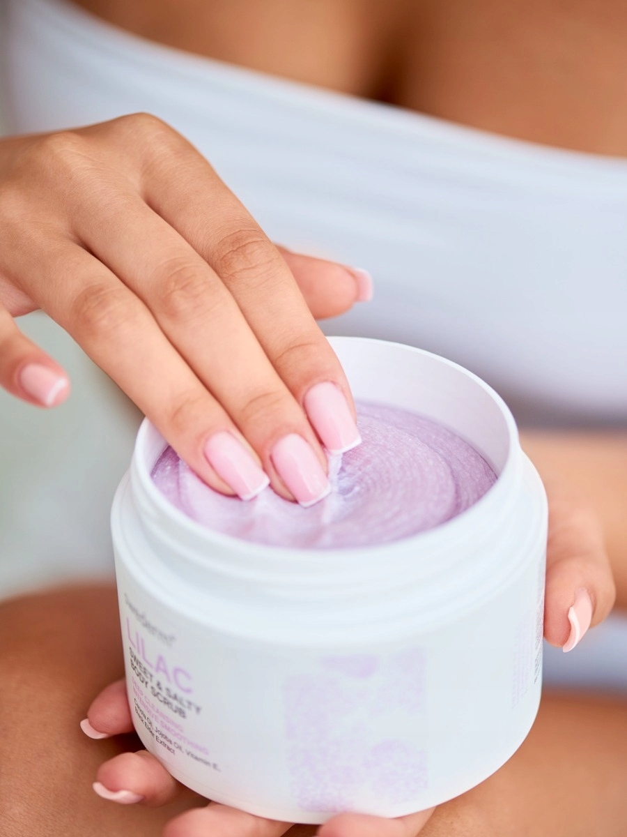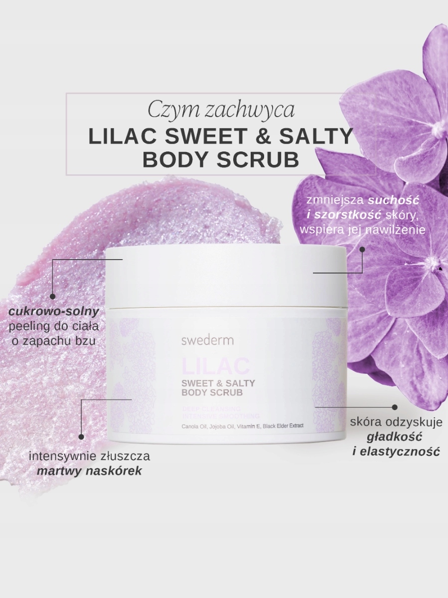 Пілінг-пілінг LILAC SWEET & SALTY BODY SCRUB містить кристали цукру та солі, які дозволяють ефективно та швидко видалити ороговілий шар епідермісу, роблячи шкіру м’якою та оксамитовою. Формула, багата оліями каноли тажожоба, створює оклюзійний шар на поверхні шкіри, який захищає від надмірного випаровування води, підтримуючи належне зволоження епідермісу. Шкіра пом'якшена і приємна на дотик. Разом з додаванням вітаміну Е інгредієнти, що містяться в пілінгу, мають антиоксидантні властивості.