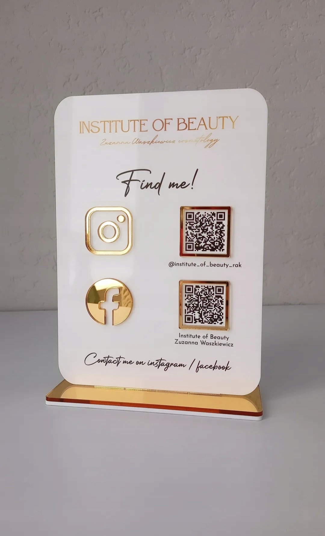 планшет виготовлений з білого акрилу, а дзеркальні елементи золота, сріблястого або рожевого -zloty (Rosegle). Ми друкуємо QR -коди, це не наклейки. Друк довговічний і не відпаде або не буде диким. Ми можемо поставити будь -який текст та QR -код. Розмір становить 23x16 см (2 Kodes) або 26x16 см (3kody)