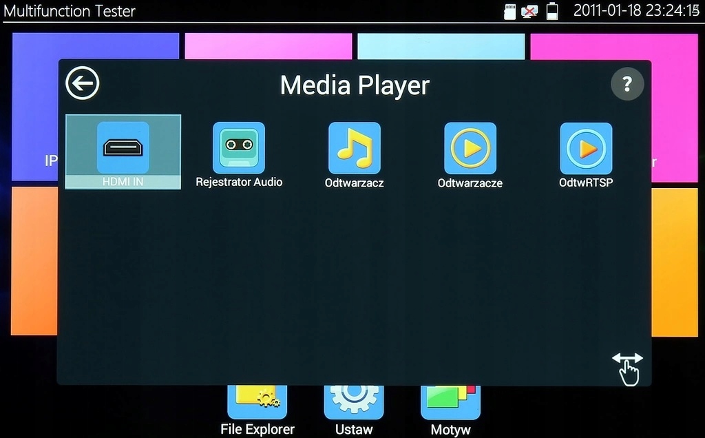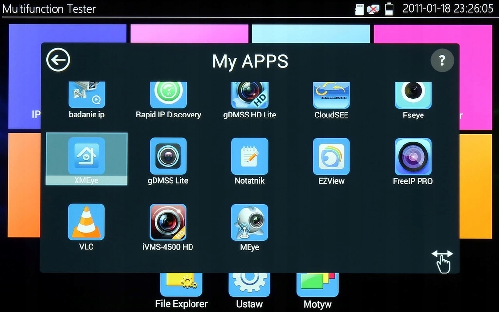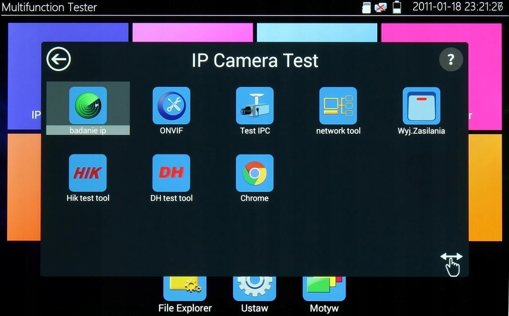 - Вибрані функції: Тест камери AHD, Тест камери HD-CVI, Тест камери HD-TVI, Тест камери PAL /NTSC, Тест IP-камери - Підтримувані методи стиснення зображення: H.265, H.264, MJPEG, пошук і попередній перегляд Onvif-сумісних IP-камер, керування ротаторами та PTZ-камерами (швидкісні купольні), перегляд з IP-камер за допомогою вбудованих програм - CloudSEE, gDMSS HD Lite, Fseye, XMEye, gDMSS Lite, EZView, FreeIP PRO, iVMS-4500 HD, MEye, Вбудований веб-браузер - Google Chrome, Генератор сигналу керування, Моніторинг з'єднання LAN, Сканер IP-адрес, PING - тестування посилання за допомогою пакетів ICMP, виявлення підключеного порту в комутаторі, тестер кабелю витої пари, взаємодія з камерами та комутаторами PoE, вимірювач потужності PoE, джерело живлення DC 5 В / 12 В / 48 В, монітор даних - монітор послідовного порту RS-485, аудіо тест, Hotspot - Wi-Fi, Запис відео на карту micro SD з можливістю відтворення - 8 Гб в комплекті, Відтворення запису, Калькулятор, Вбудований ліхтарик, Підсвічування кнопок