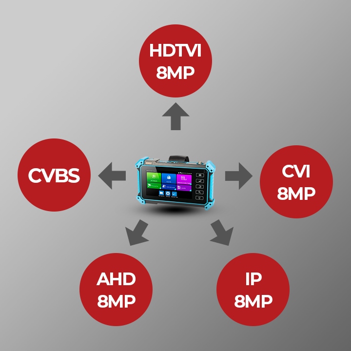 5-дюймовий тестер камери з IP-камерами IPS. Роздільна здатність екрана - 1920x1080, що дозволяє відображати камери FHD високої роздільної здатності. Пристрій підтримує та підтримує багато протоколів, таких як onvif або ptz.