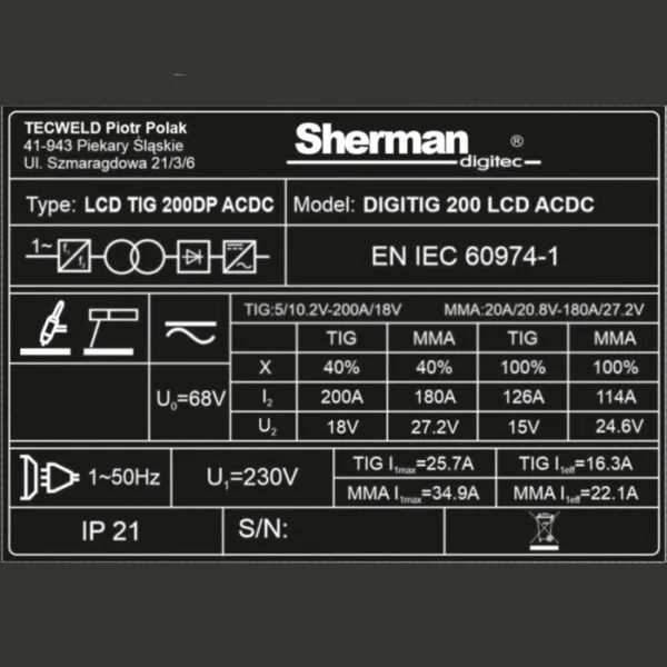 TIG AC DC 200 A SHERMAN DIGITIG LCD PULS MMA 2IN1 ALUMINIUM INOX