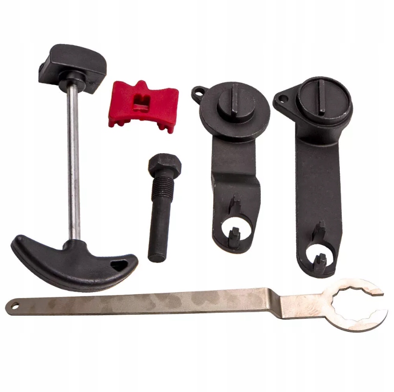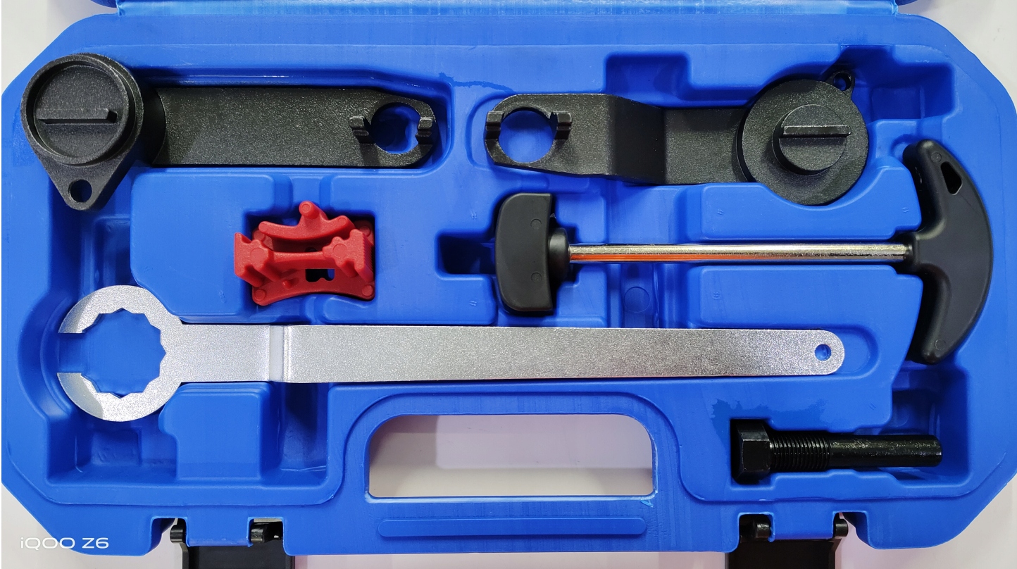 - Набір інструментів синхронізації містить основні інструменти для блокування розподільного вала, заміни валу кривошипа та заміни ременів часу. Усі деталі постачаються у сяючій валізі, яка полегшує зберігання та транспортування.