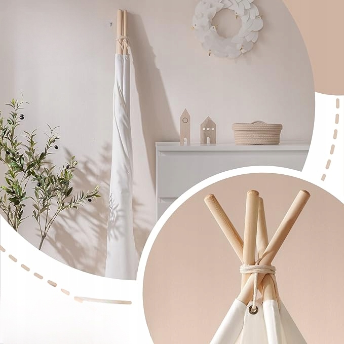 Наш наконечник для дітей виготовлений з товщі, біле полотно зі 100% бавовною. Матеріал приємний на дотик і зручний для дітей. Поставляється легкими ланцюгами та товстим, не -слизковим килимком, який забезпечує додаткову забаву та захист . Дерев’яні стрижні виготовлені з міцної деревини, і завдяки потовщенню намет дуже стабільний і не так легко зламається.