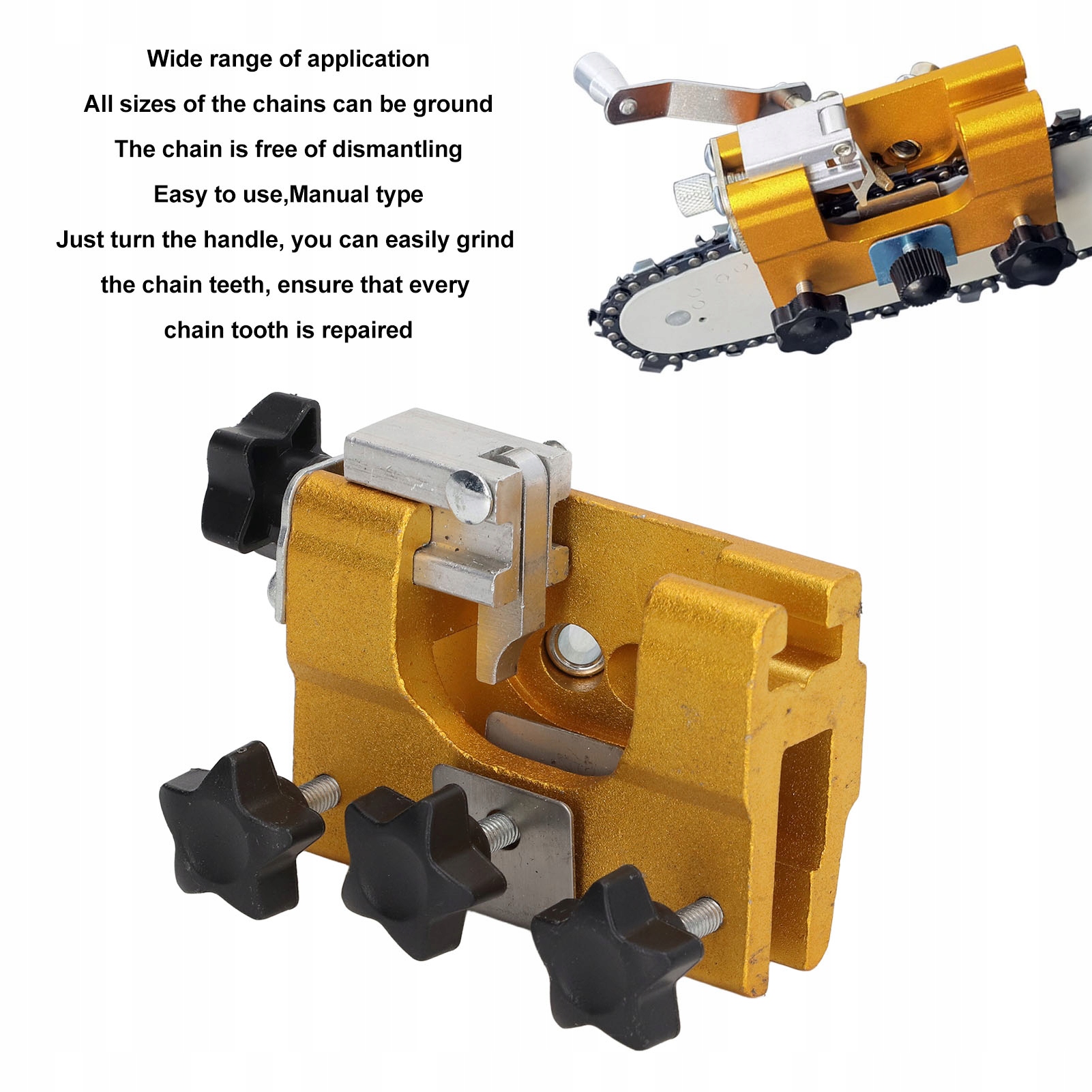 1. РУЧНИЙ ТИП: Оснащено коромислом, просто поверніть ручку, ви можете легко сточувати зуби ланцюга, переконайтеся, що кожен зуб ланцюга закріплений.
