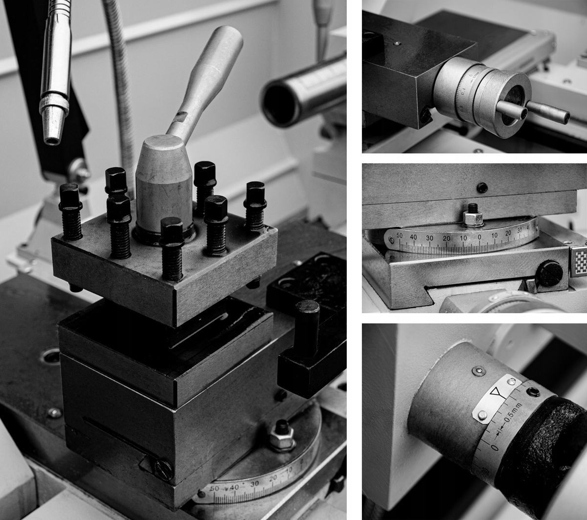 Чотирипозиційний imak дозволяє монтувати токарні інструменти розміром 20x20 мм. Конструкцію лещат можна повертати на ± 50 мм. Це дозволяє точніше працювати та налаштовувати інструмент під кутом, який використовується, зокрема, для точіння коротких конусів.