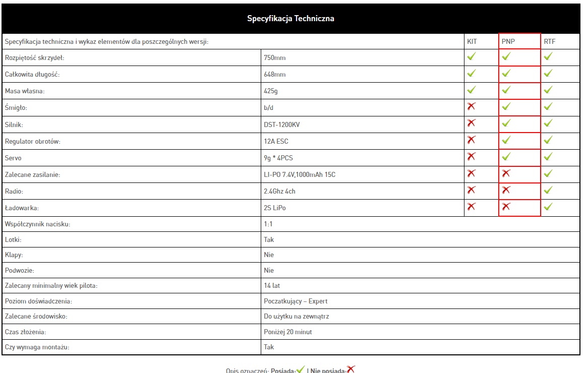 Літак у версії PNP, в комплект входить модель, двигун, регулятор і сервоприводи. Ви повинні придбати акумулятор, зарядний пристрій, передавач і приймач самостійно.