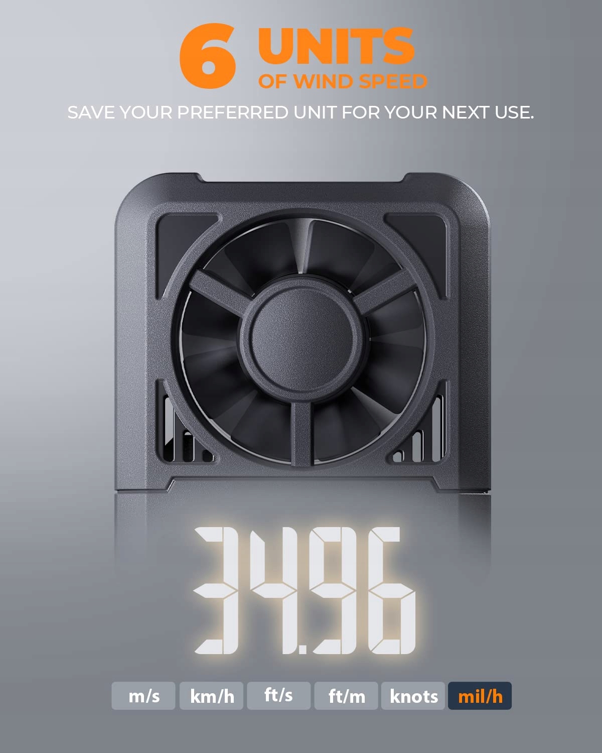 Анемометр з 6 вимірювальними одиницями: Цей пристрій для вимірювання швидкості вітру оснащений легко обертовими лопатями вентиляторів і вимірює швидкість вітру в 6 одиницях: фути в хвилину (фути/м), ноги в секунду (фути/с), миля протягом години (миль/год), вузли (вузли), кілометри на годину (км/год), метри за секунду (м/с). Використовуйте його для оцінки потоку повітря в приміщеннях, таких як ОВК, вентиляційні отвори, видалення пилу, регістри тепла