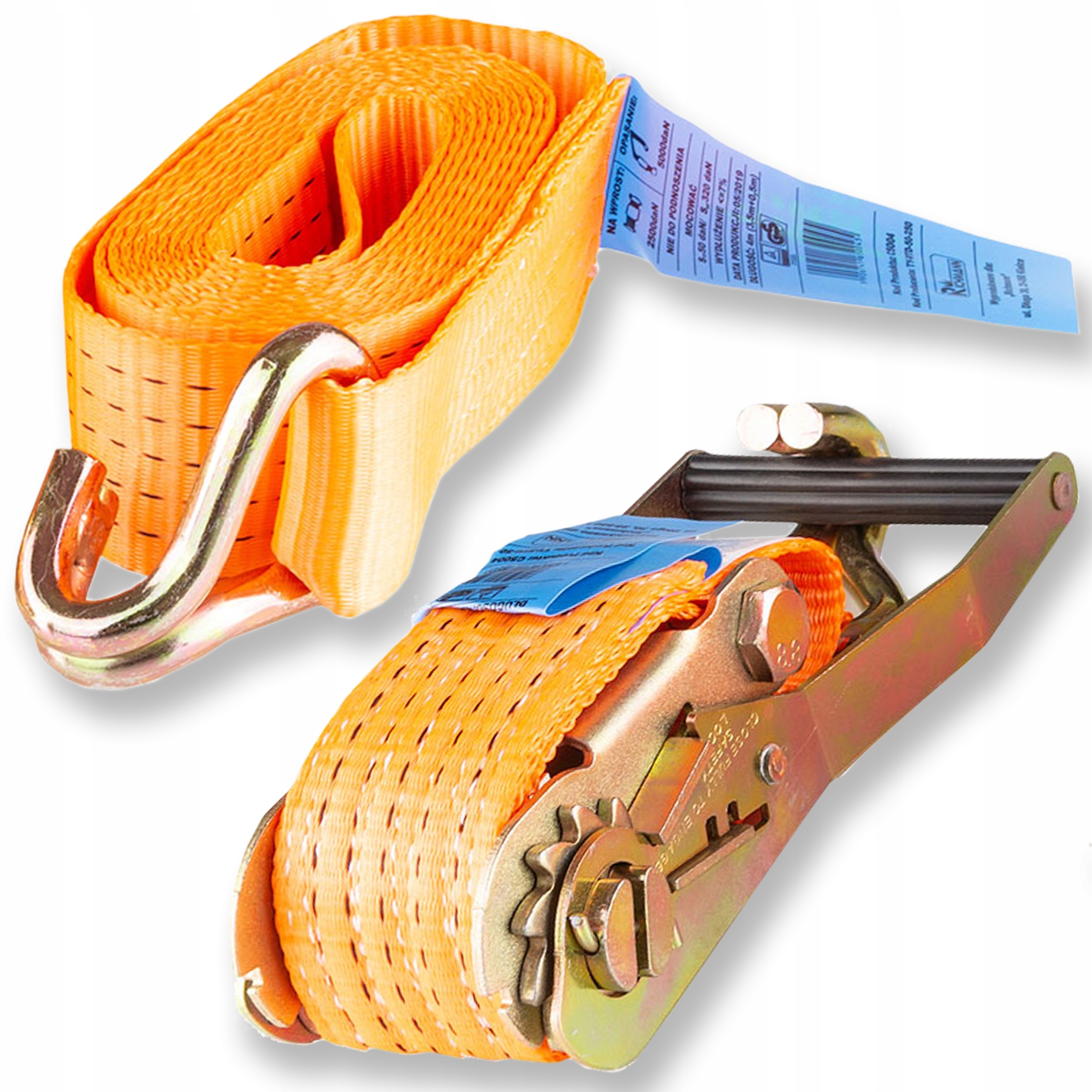 Призначений для кріплення вантажу, що перевозиться. Виготовлений з низькорозтяжної поліефірної стрічки (<=7%). Допускається пряме кріплення (2500 даН) або скріплення (5000 даН) предметів, що транспортуються. Додаткова ергономічна ручка підвищує комфорт затягування пояса. Стійкий до більшості хімічних речовин, таких як жир, масла, кислоти. Виготовлений з високоякісної сталі з додатковими зміцнюючими тисненнями.Виріб відповідає стандартам EN12195-2:2000 і має знак якості GS і TUV.