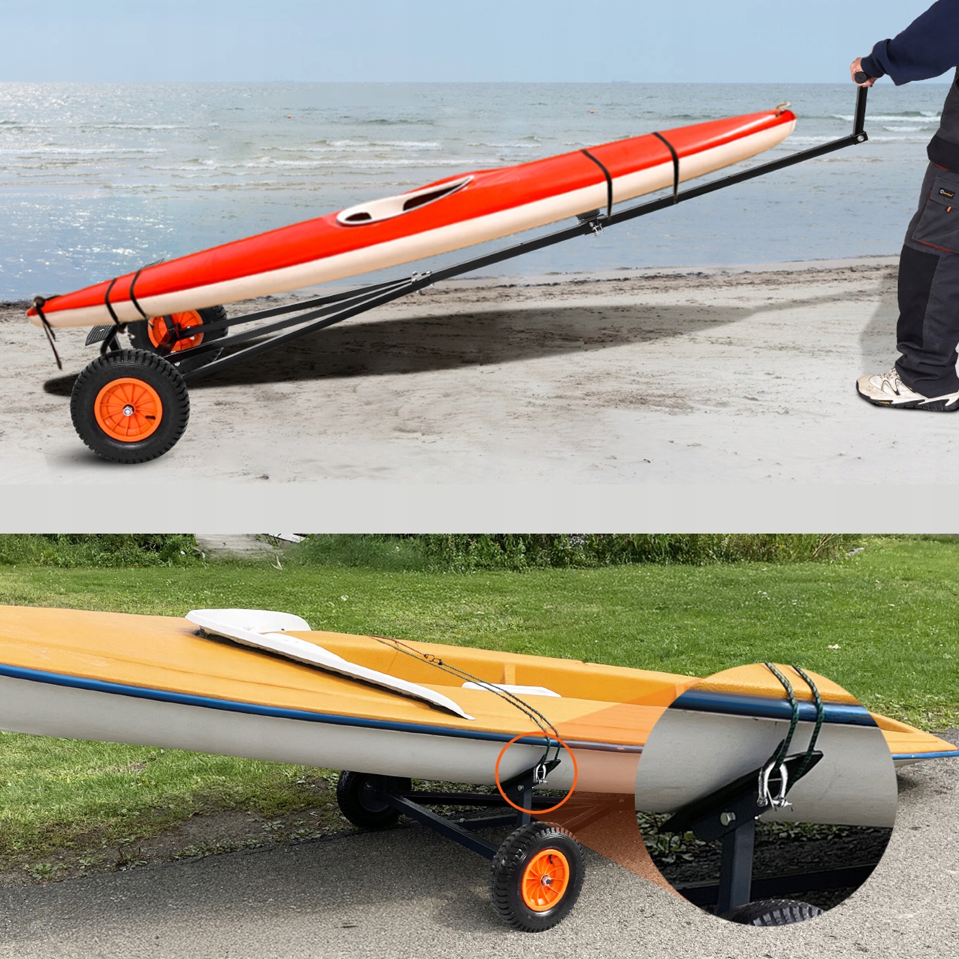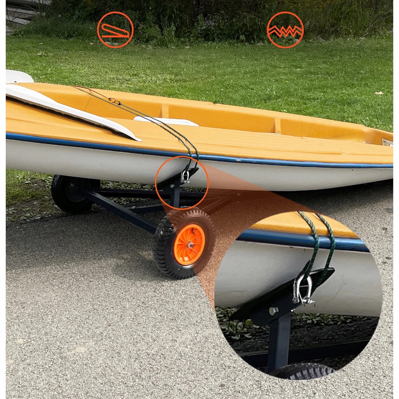 Конструкція коляски виготовлена з високоякісної вуглецевої сталі , яка надзвичайно міцна і забезпечує тривалий термін експлуатації. Поверхня оцинкована та пофарбована в порошок , яка ефективно захищає від іржі та корозії навіть під час тривалого використання зовні, у вологому середовищі. не -скапінні гумові кронштейни забезпечують кріплення човна, захищаючи його дно від подряпин та забезпечуючи безпеку.