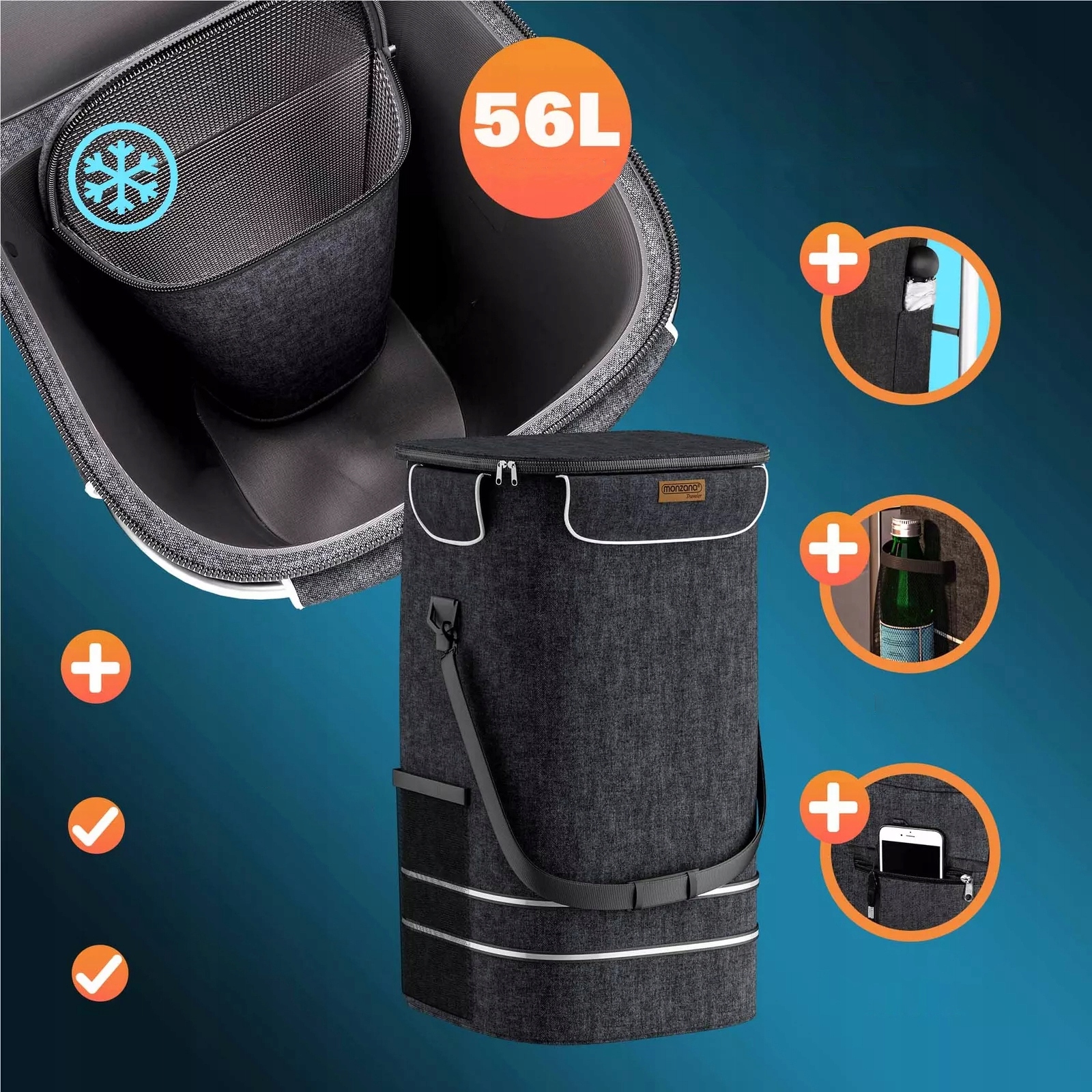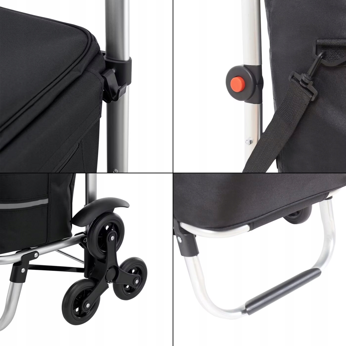 - Завдяки потужності до 56 літрів та вантажопідйомності 50 кг, ця коляска виправить ваші потреби в покупці. Його можна використовувати багатьма способами: як інвалідне крісло на колесах, сумки для плечей або, знявши сумку, як невелику коляску. 4 Покриття PU робить колеса діаметром 10 см надзвичайно міцними. У дощові дні знімний біль захищає від проникнення води та піску. 4 Набір також включає 5-літровий мішок, який є водонепроникним та добре утепленим. 4