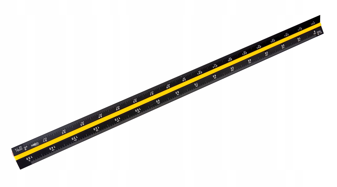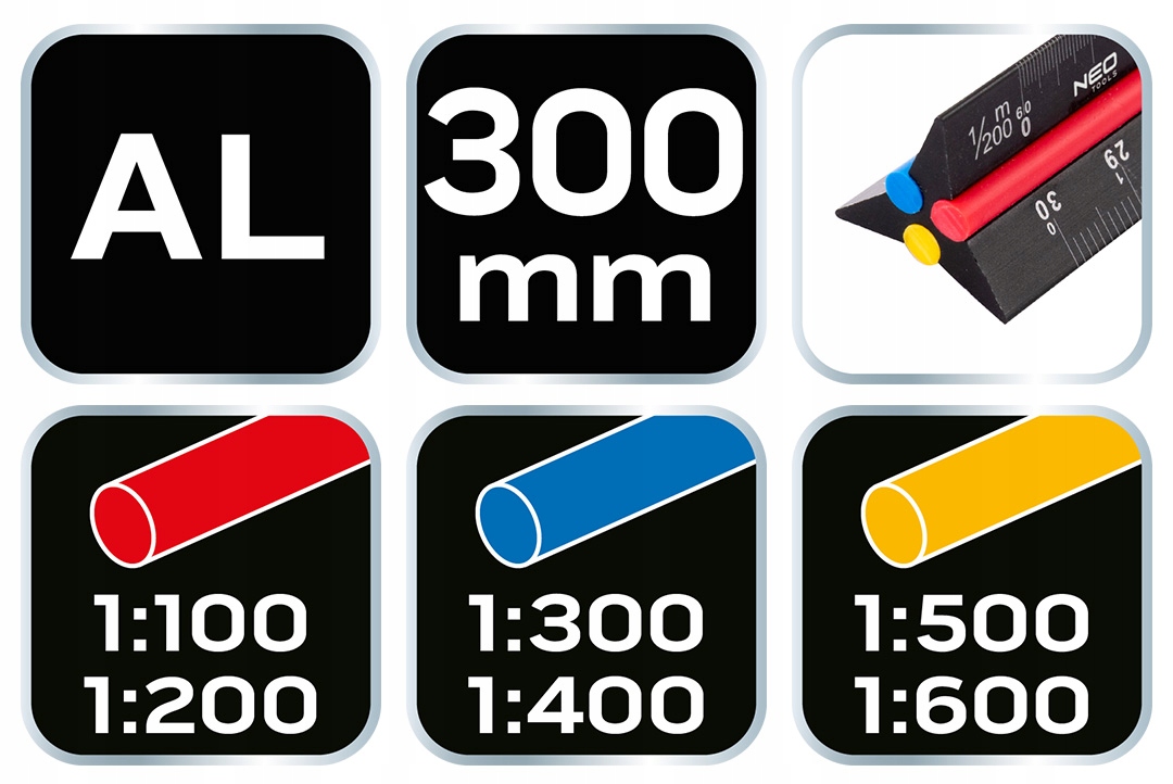 Трикутна лінійка NEO (арт. № 72-205), довжиною 30 см, має кольорові маркери з ПВХ. Виготовлена з високоякісного анодованого алюмінію, боки лінійки мають колірне кодування в залежності від масштабу для зручності вибору потрібного масштабу: червоний - масштаб 1:100; 1:200, синій масштаб: 1:300; 1:400, жовтий - масштаб 1:500; 1:600.