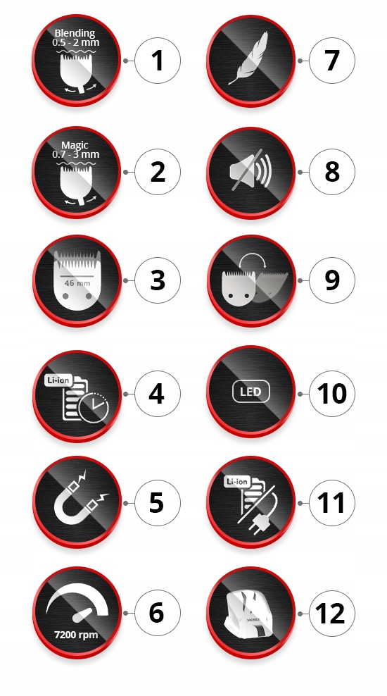 Moser Kuno 1887-0050, Це бездротова/провідна машина з тихимдвигуном постійного струму, який генерує до 7200 об/хв іLi-Ionбатарея на постійній швидкості з функцією MultiClick® має 5 налаштувань різання ЗМІШУВАННЯ леза в діапазон від 0,5 мм до 2 мм + додаткове змінне лезо MAGIC із 5 налаштуваннями різання в діапазоні від 0,7 мм до 3 мм + і 6 магнітними насадками: 1,5 мм, 3 мм, 4,5 мм, 6 мм, 9 мм, 12 мм b>