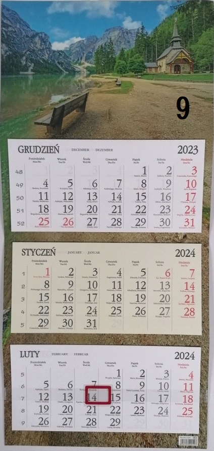 Календар: польською, англійською, німецькою, російською мовами, подвійні іменини, нумерація тижнів, стрічка з віконцем