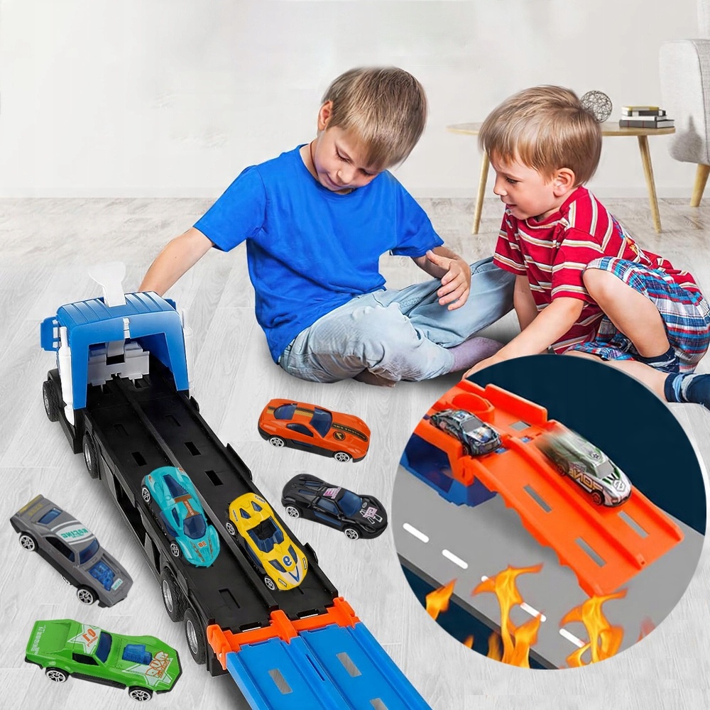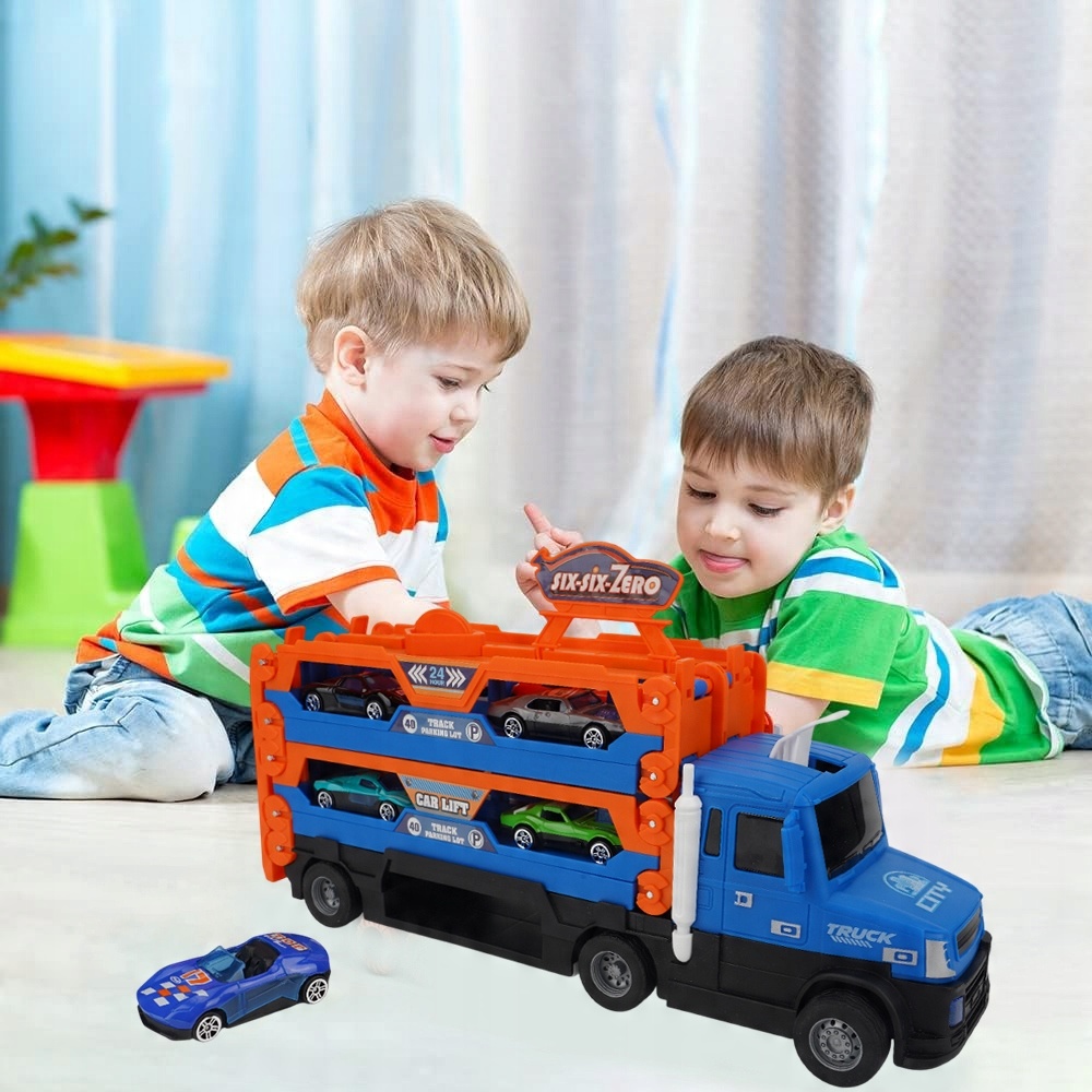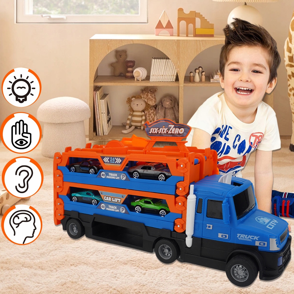 - Маршрути барвисті та детальні, завдяки якому вони створюють чудове гоночне враження. Доріжка - 55 дюймів, завдяки якому діти мають багато місця для тестування швидкості та спритності автомобіля. 4 Структура акторської ролі гарантує, що автомобіль досить міцний і довговічний, щоб протистояти труднощам інтенсивного геймплея. 4 Просто натисніть передню частину вантажівки, щоб запустити реалістичні звуки двигуна, ріг та миготливі вогні.