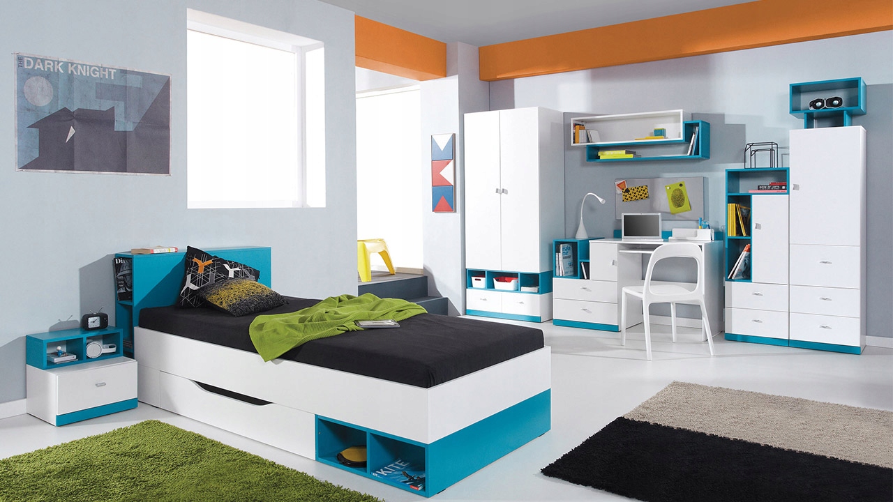 Mobi - колекція меблів для підліткової та підліткової кімнати. Для білих меблів характерні контрастні бірюзові та жовті вставки.