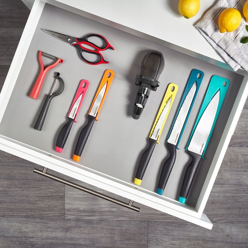 Ергономічна, елегантна ручка дозволяє утримувати ніж для деяких і зручних, під час кожного руху. Обкладинки у унікальних кольорах мають отвори, які дозволяють повісити ножі на гачках. Система блокування в кожухах запобігає доступу до леза, забезпечуючи безпеку.