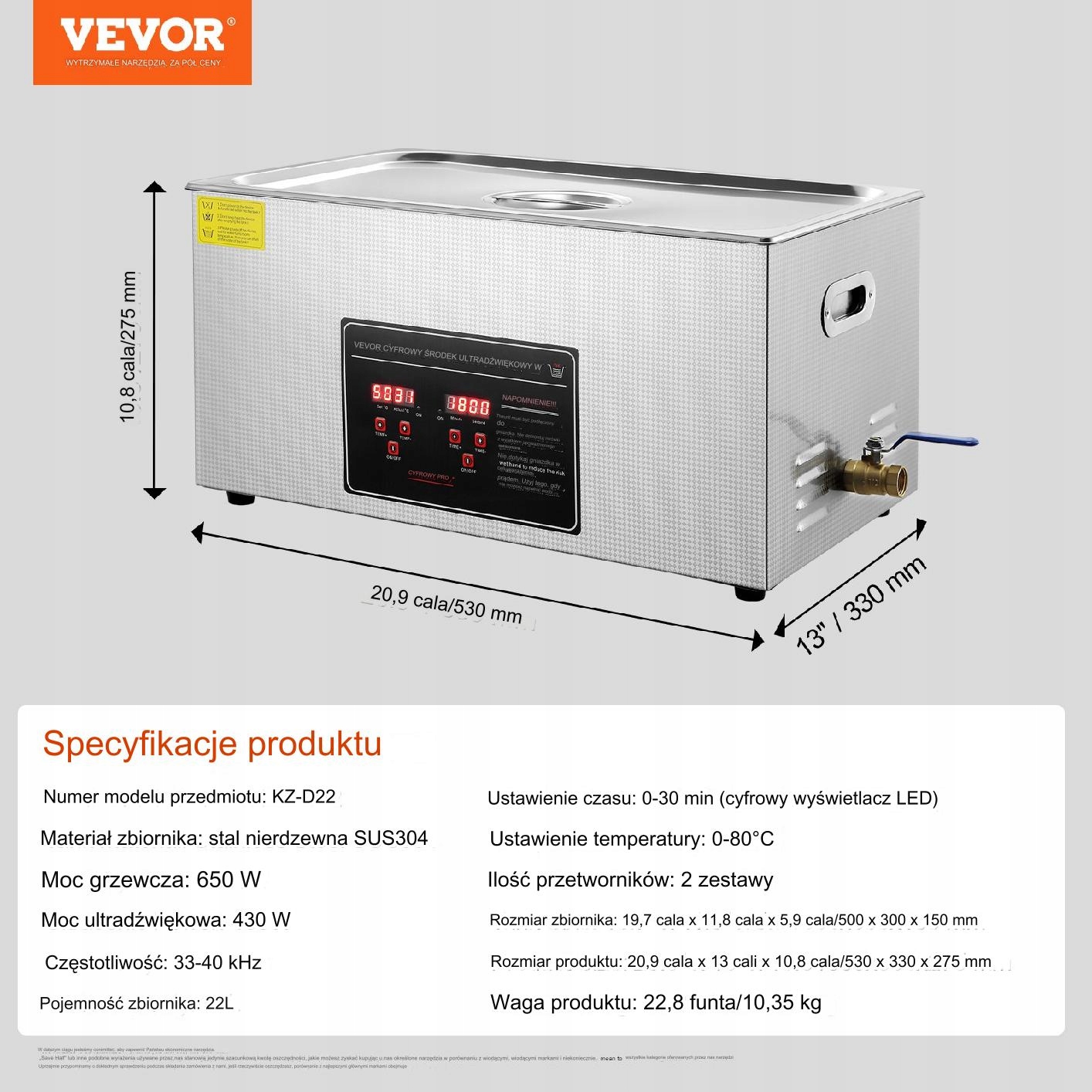Резервуар ультразвукового очищувача виготовлений з високоякісної нержавіючої сталі SUS304, що забезпечує не тільки довговічність пристрою, але й безпеку предметів, що очищаються. Ємність 22 літри робить пральну машину ідеальною для чищення цінних речей, таких як ювелірні вироби, окуляри чи годинники, гарантуючи повну точність і ніжність.