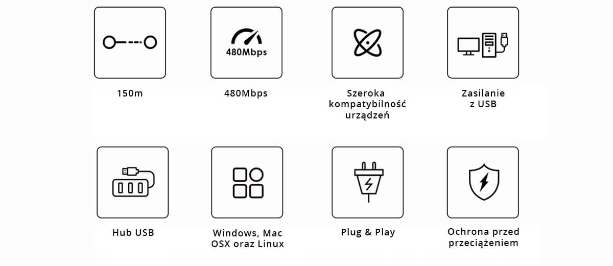 передавач USB підтримує такі пристрої такі як принтери, сканери, фотоапарати, носії даних, клавіатури, миші та інші пристроїв. Використовуваний екстендер ідеально підходить для повсякденної роботи комп’ютер, у системі навчання, у відеоконференціях, у моніторингу та багато інших програм.
