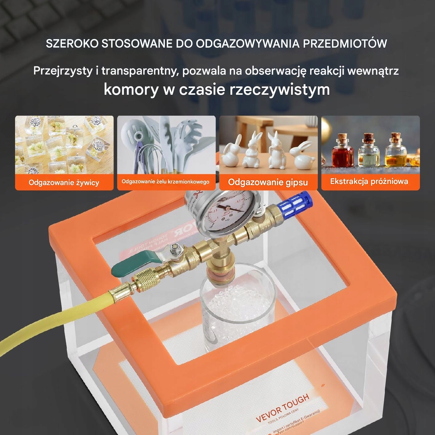 Вакуумна камера Vevor характеризується густим і дуже прозорим акриловим корпусом , відомим своєю міцністю та стійкістю до високого тиску. Після тестів було встановлено, що він має швидкість витоку близько 5% за 12 годин, що робить його ідеальним для вентиляції за допомогою силікону та інших матеріалів.