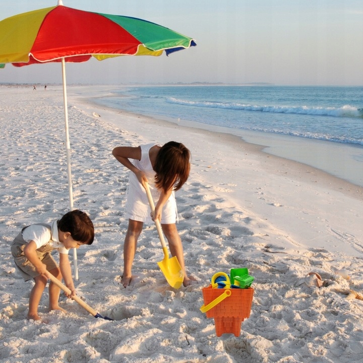 НАБІР ІГРАШОК ДЛЯ ПІСОЧНИЦІ, ДЛЯ ПЛЯЖУ - ВІДРО З РАБИНАМИ, ЛОПАТКА ТА ФОРМИ, ЛІЙКА.