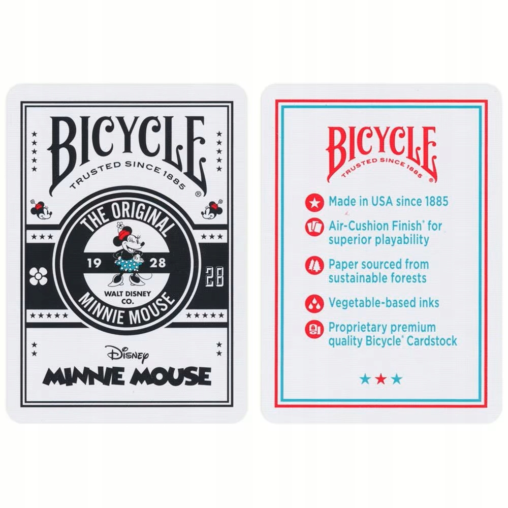 талія натхненна класичною формою Мінні Мауса, представляючи її характерні елементи, такі як крапки, капелюх та підбори. Фігуральні картки були спеціально розроблені, представляючи Мінні та Міккі як королівську пару, яка додає особливу принадність. Кожна талія виготовлена за власним, унікальним папером і покрита спеціалізованим пластиком. Ексклюзивна особливість велосипедних карт - це обробка повітряної подушки. Ця секретна формула робить велосипедні картки довшим життям, їх легше переміщувати та розповсюджувати - що значно робить карткову гру приємнішою! Завдяки таким високим стандартам клієнти довіряють велосипедним продуктам протягом багатьох років.