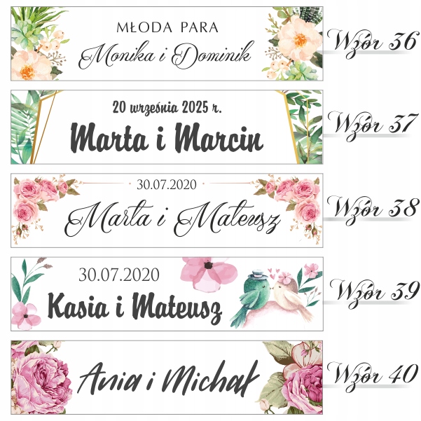 Наприклад: ( таблиця 1: Аня та Марчін, шаблон 5, зверніть увагу на зміну шрифту з таблиця № 5 на шрифт з таблиці № 8, таблиця 2, шаблон 5, Наречений і наречена, примітка: зміна шрифту з таблиці № 5 на шрифт з таблиці № 8)