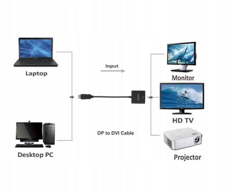 Адаптер дозволяє підключити пристрій з розеткою DisplayPort до кабелю, оснащеного DVI. Кабель, оснащений штепсельною поштою DVI