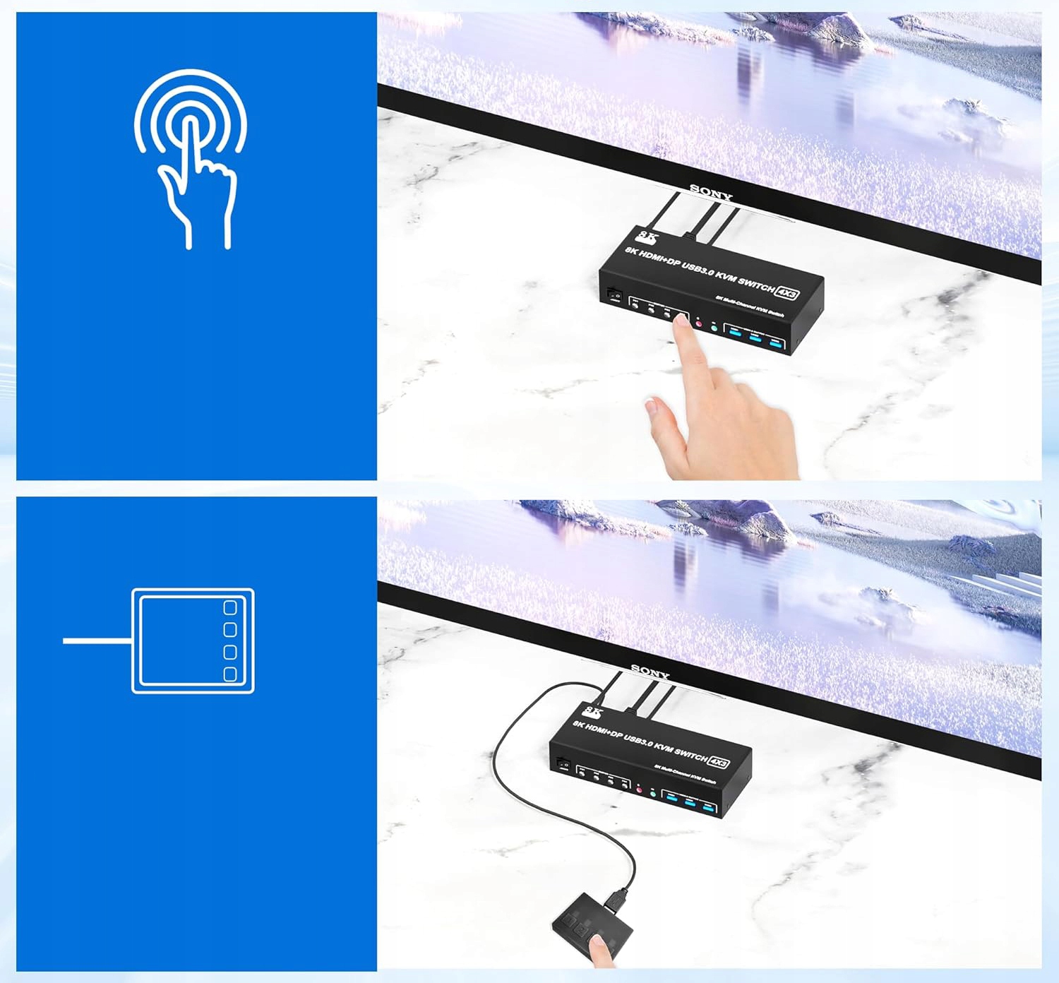 - У наборі: KVM Switch , USB 3.0, USB -кабелі, джерело живлення та дротова кнопка.