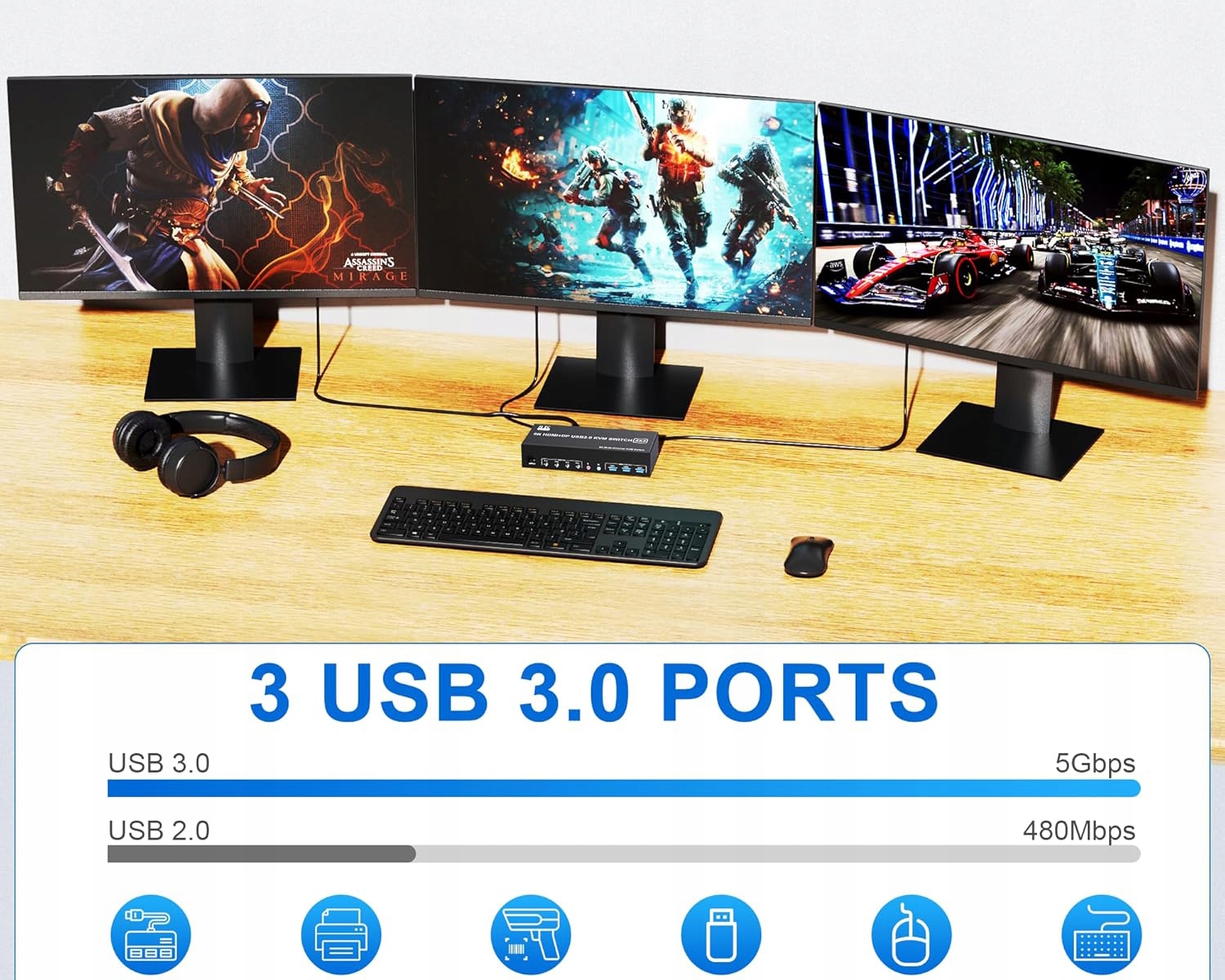 Використовується перемикач KVM 3 Монітори 4 Комп'ютери - ідеальне рішення, яке дозволяє ефективно керувати багатьма комп'ютерами. Завдяки його додатку ви можете підключити чотири пристрої - як ноутбуки, так і настільні комп'ютери - до одного набору клавіатури , мишей та трьох моніторів. Люди, які працюють з багатьма операційними системами або потребують різних доступних даних в одному місці, оцінять комфорт та зручність, пропоновані цим пристроєм. Це ідеальне рішення для професійних користувачів, програмістів та людей, які працюють у творчій індустрії, де багатозадачність - це повсякденне життя.