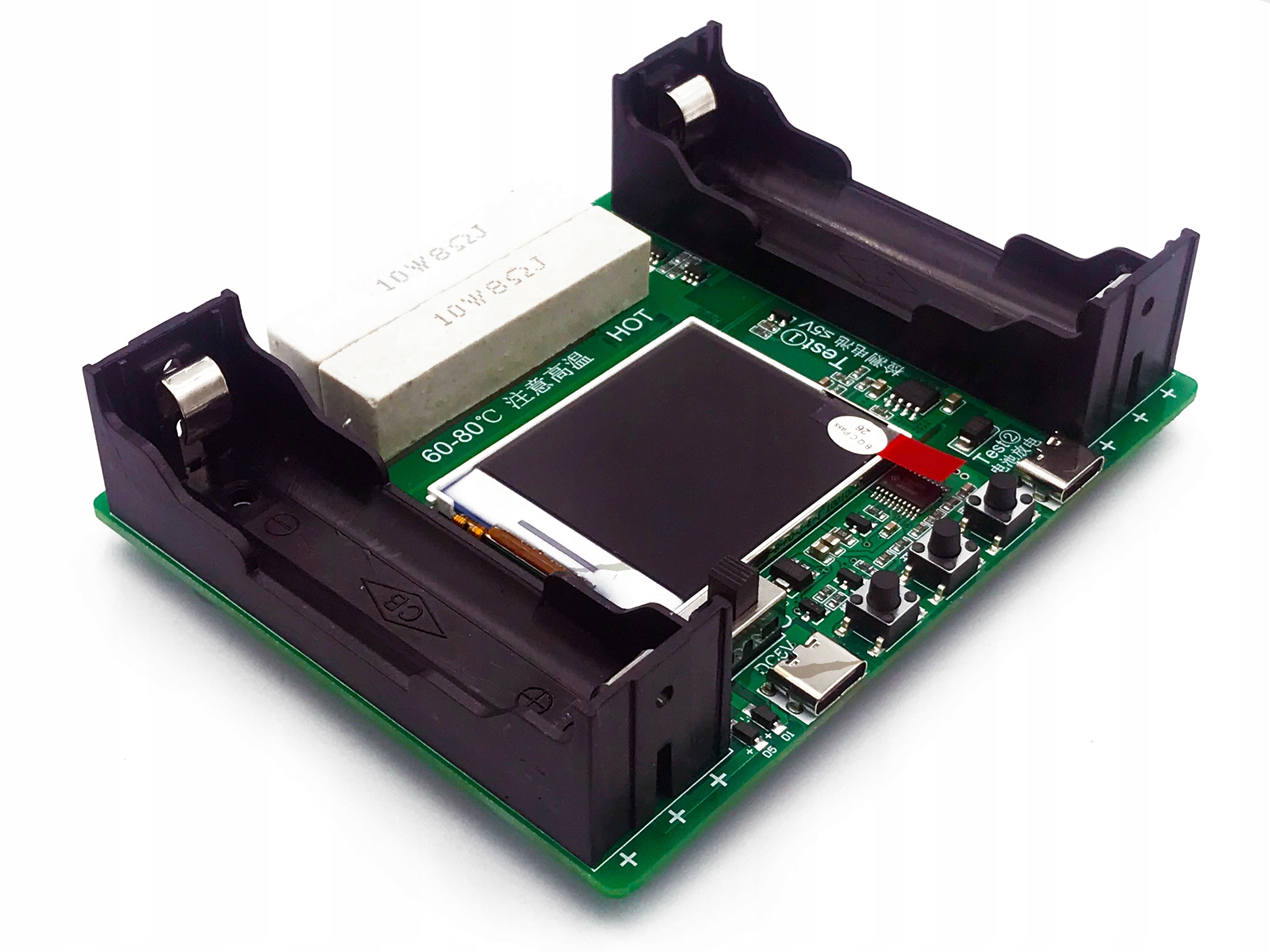 Тестер елементів 18650 дозволяє вимірювати ємність і внутрішній опір елементів і має можливість заряджати елементи через вбудований порт USB-C. Тестер має два кошики для елементів, кошик праворуч призначений для перевірки елементів, а інший ліворуч – для живлення системи.