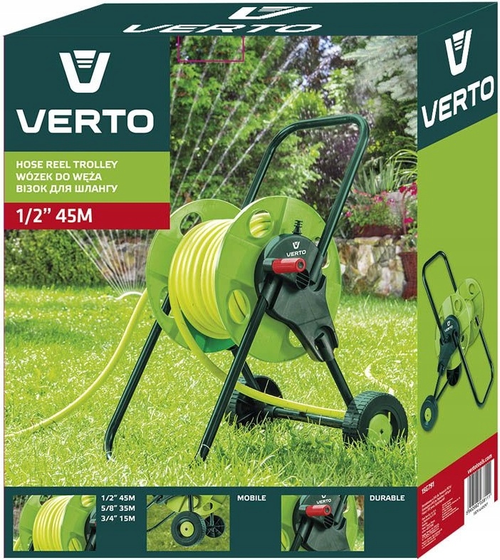 Барабан візка вміщує приблизно 45 м шланга 1/2", приблизно 35 м шланга 5/8", приблизно 15 м шланга 3/4".