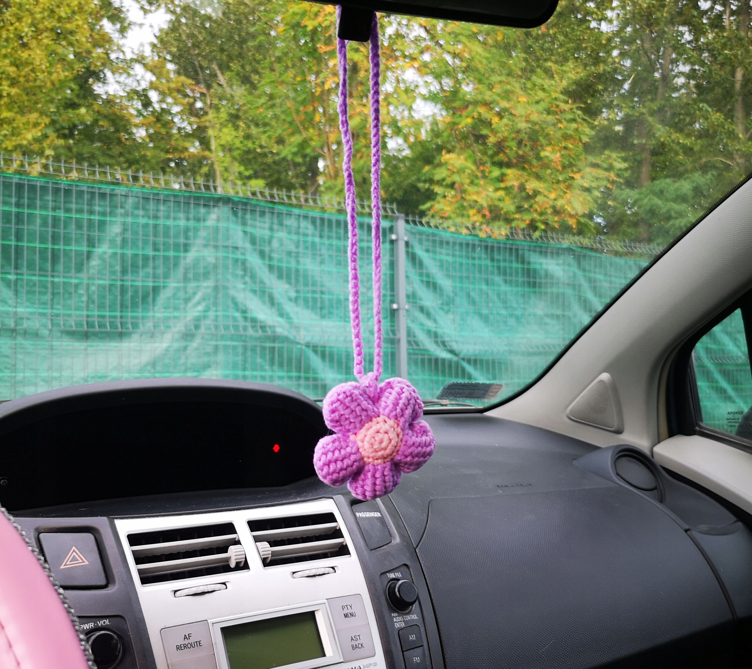 Красиво вишита фіолетова квітка з рожевою серединкою. Вічна прикраса як для автомобіля, так і для інших місць.