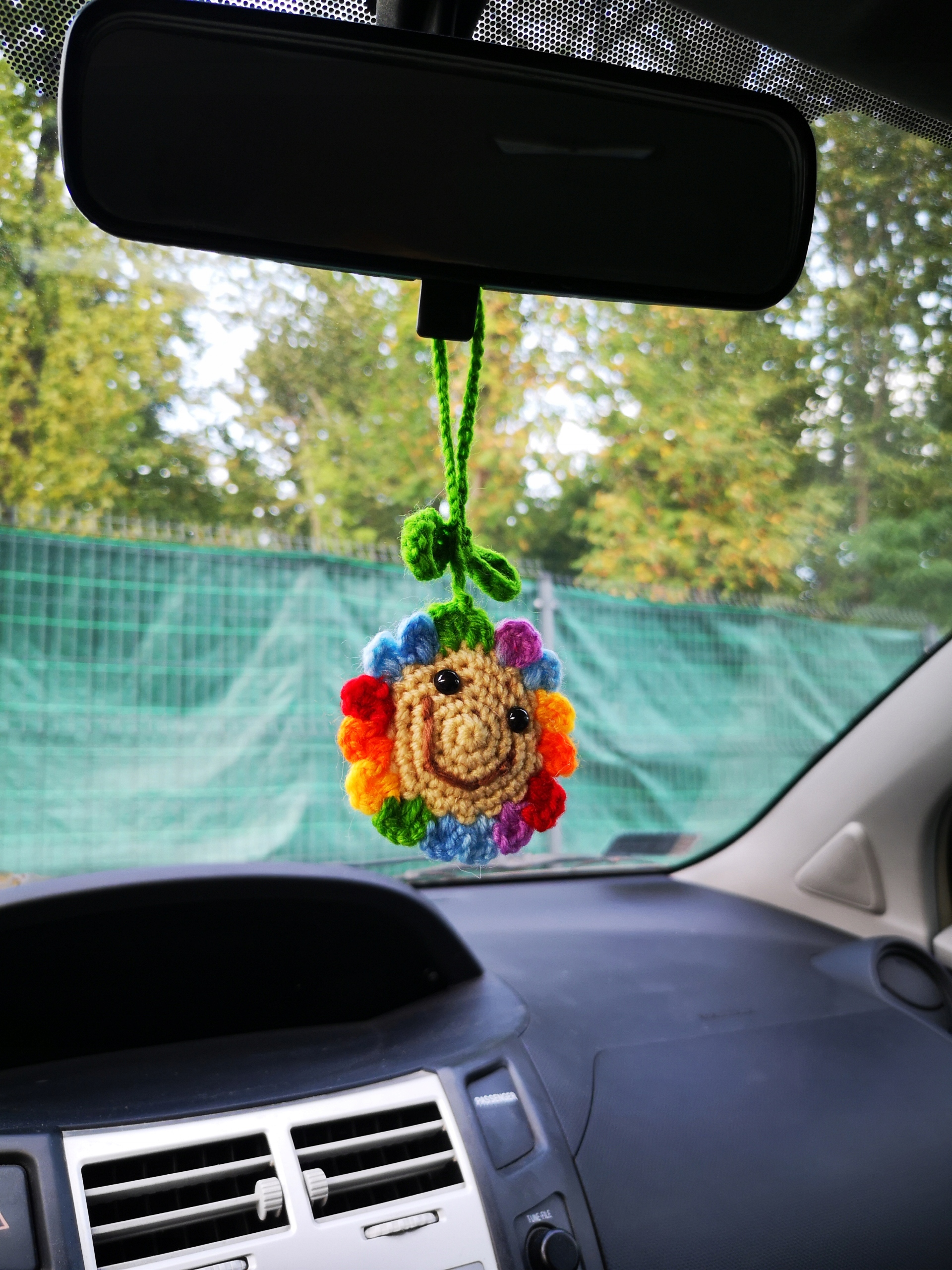 Гарна вишита різнобарвна квітка , посередині також є очі та посмішка. Додатково 2 маленьких листочка на шнурку для підвішування. Вічна прикраса як для автомобіля, так і для інших місць.