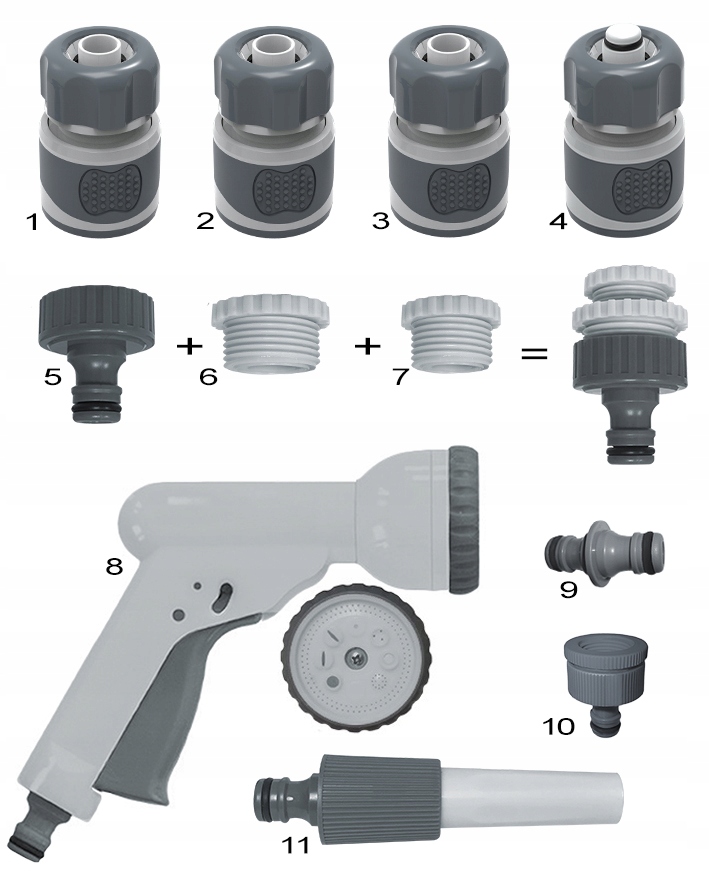 1,2,3, швидкі з’єднувачі для стандартного садового шланга 1/2” (без сплаву). Вони можуть монтуватися на кінцях шланга, що дозволяє швидко підключити інші елементи системи поливу. Виготовлений з високоякісного пластику білого та сірого кольорів. Швидкий з’єднувач оснащений відповідними профільованими зубами, які забезпечують міцне встановлення тонкостінних шлангів.