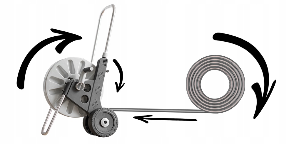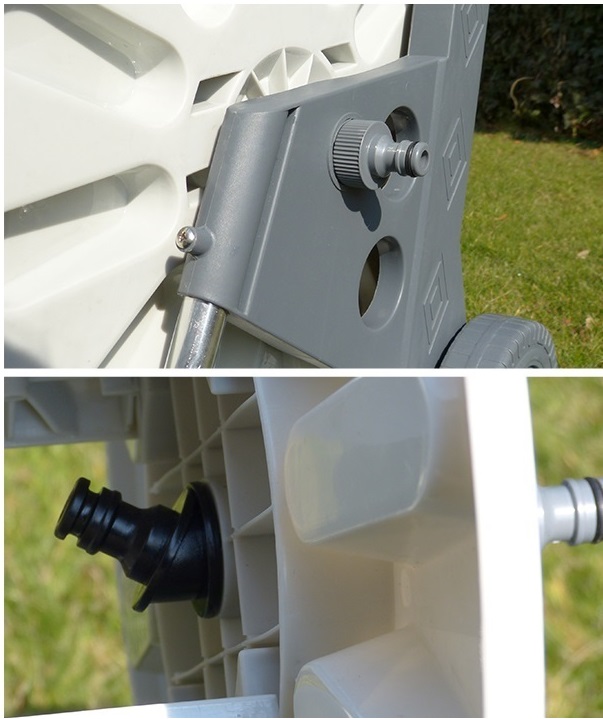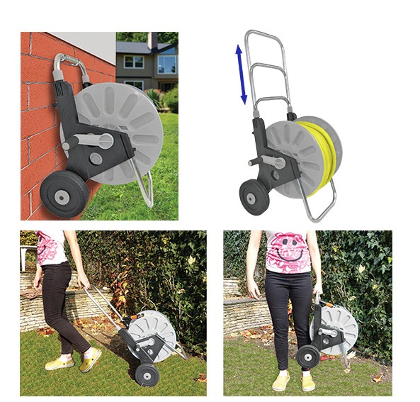 - Великі опорні колеса діаметром 18 см, що полегшує використання комплекту шлангів.