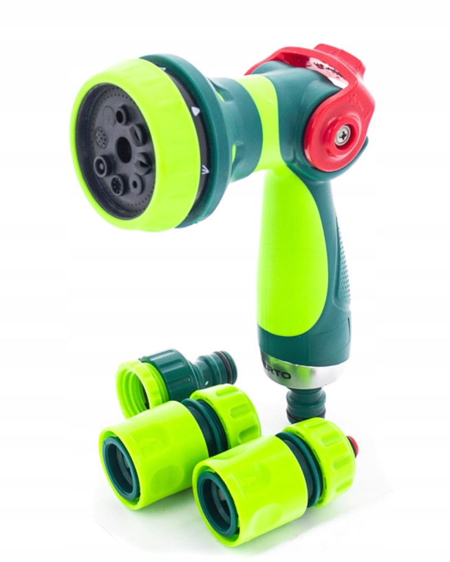 - Набір складається з 4 елементів: 8-функціональний пістолетний спринклер + 1/2" з'єднання крана + 1/2" прохідний з'єднувач + 1/2" з'єднувач упору