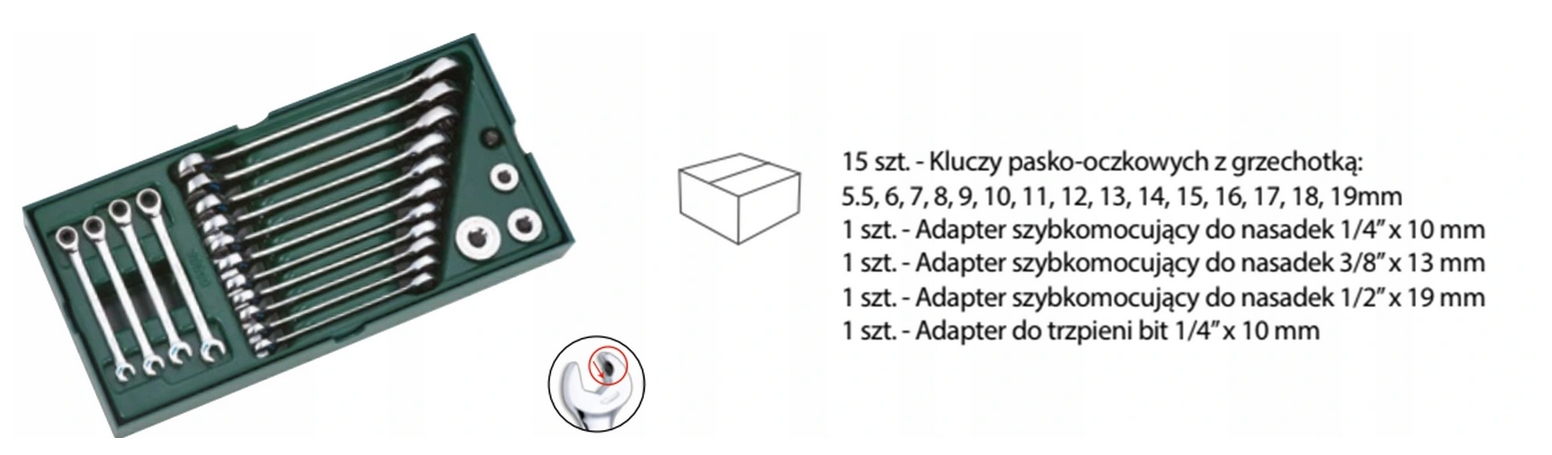 - 09908 НАБІР З 19 МЕТРИЧНИХ КІЛЬЦЕВИХ КЛЮЧІВ З ХРАПОВИКОМ